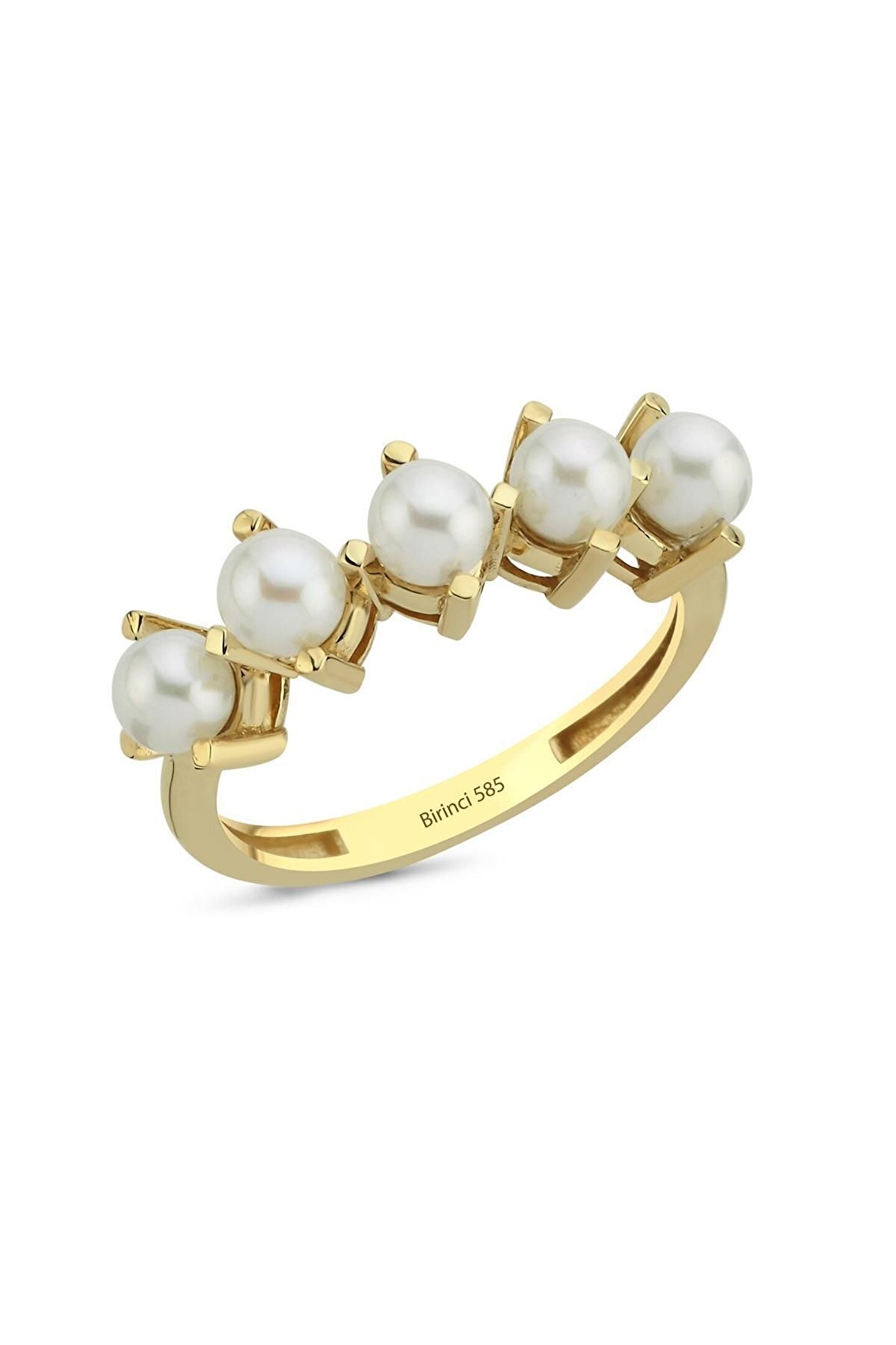 14 Ayar Altın 4 mm Kalın Tırnak Beş Doğal İncili Yüzük