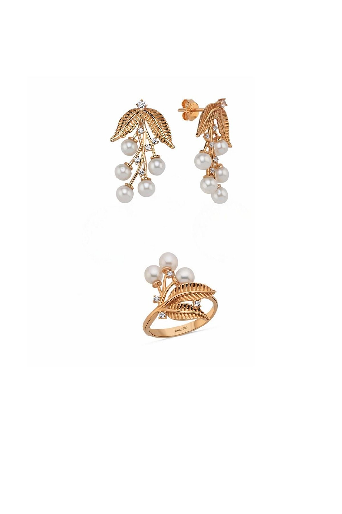 14 Ayar Altın 4 mm Zeytin Dalı Doğal İnci Küpe Yüzük İkili Set