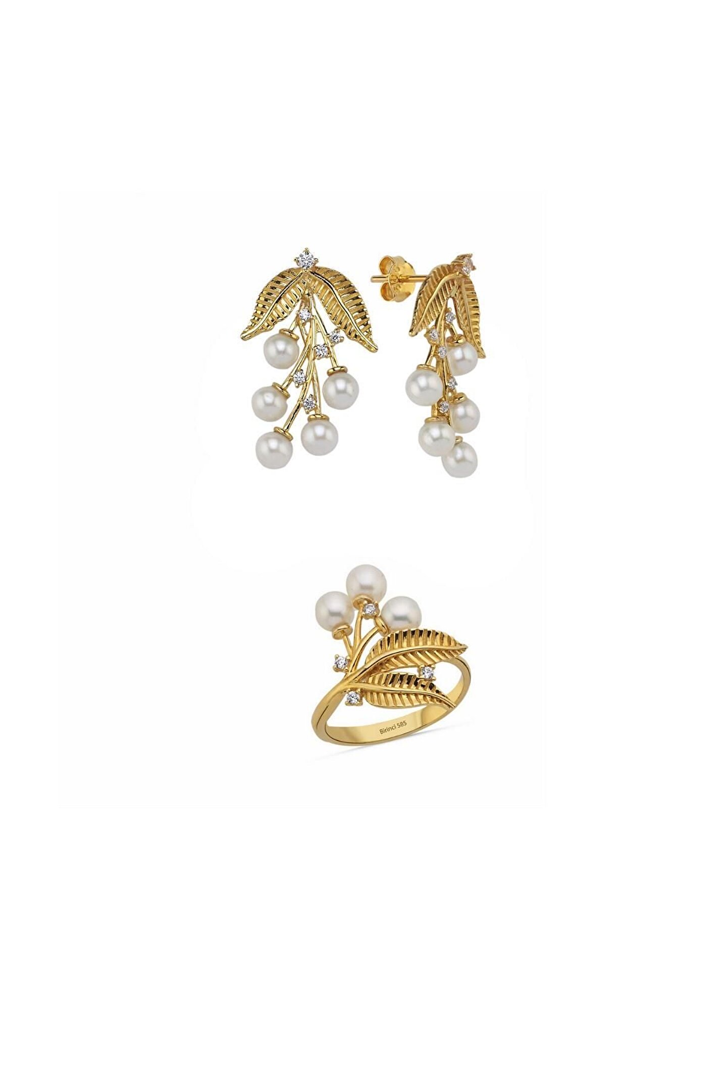 14 Ayar Altın 4 mm Zeytin Dalı Doğal İnci Küpe Yüzük İkili Set