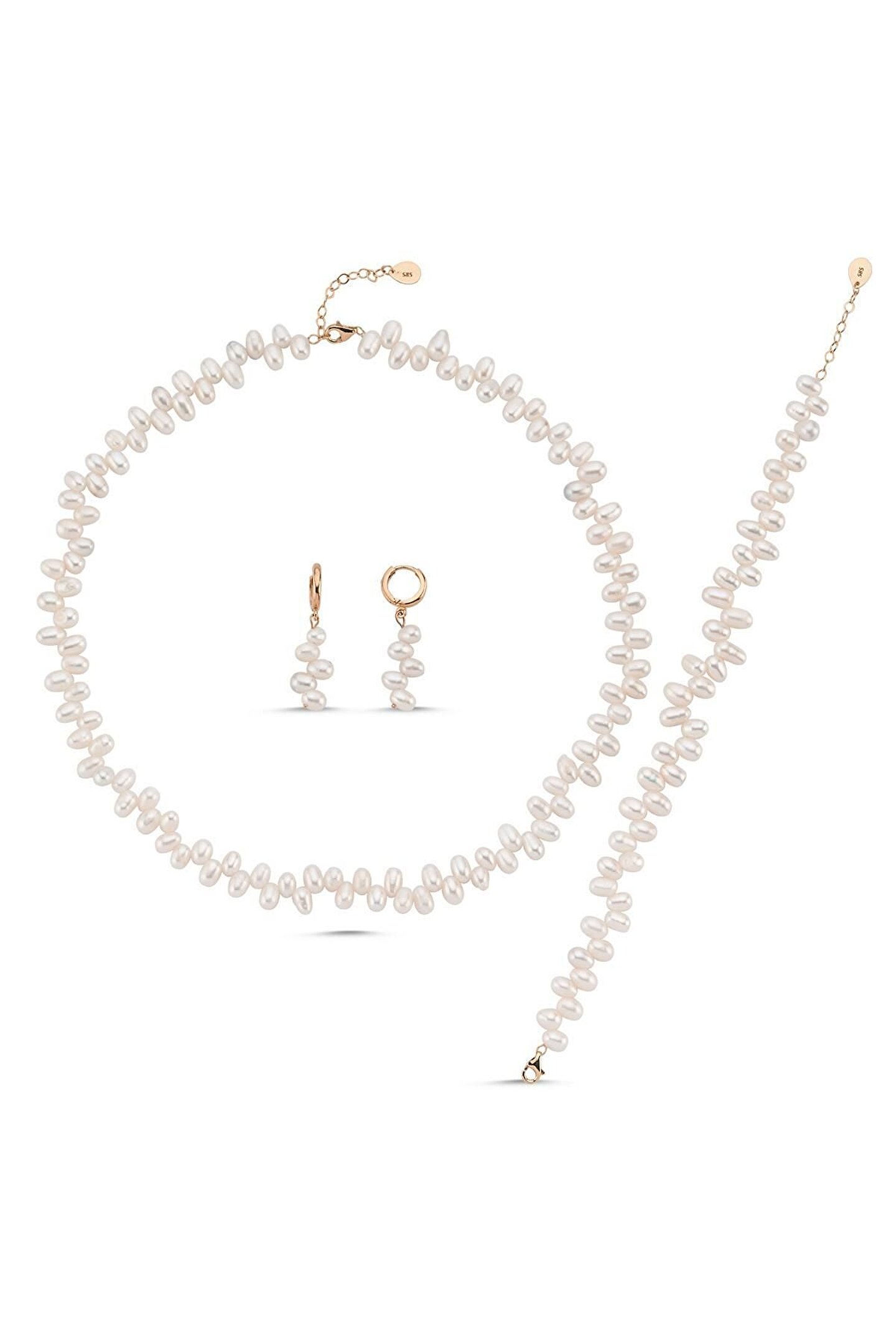 14 Ayar Altın 5 mm Barok Doğal İnci Kolye Bileklik Küpe Üçlü Set