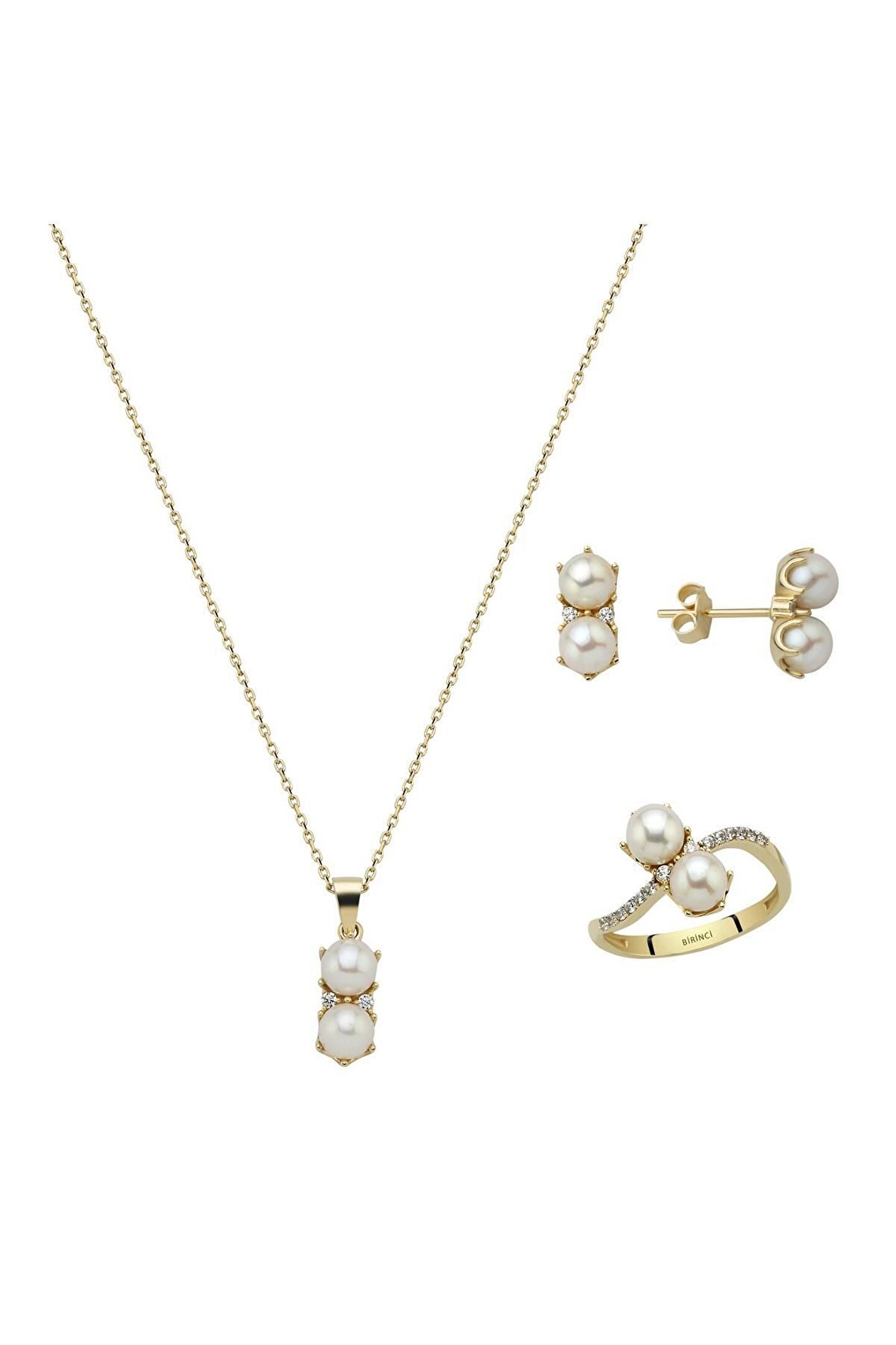 14 Ayar Altın 5 mm İkili İnci Küpe Kolye Yüzük Üçlü Set