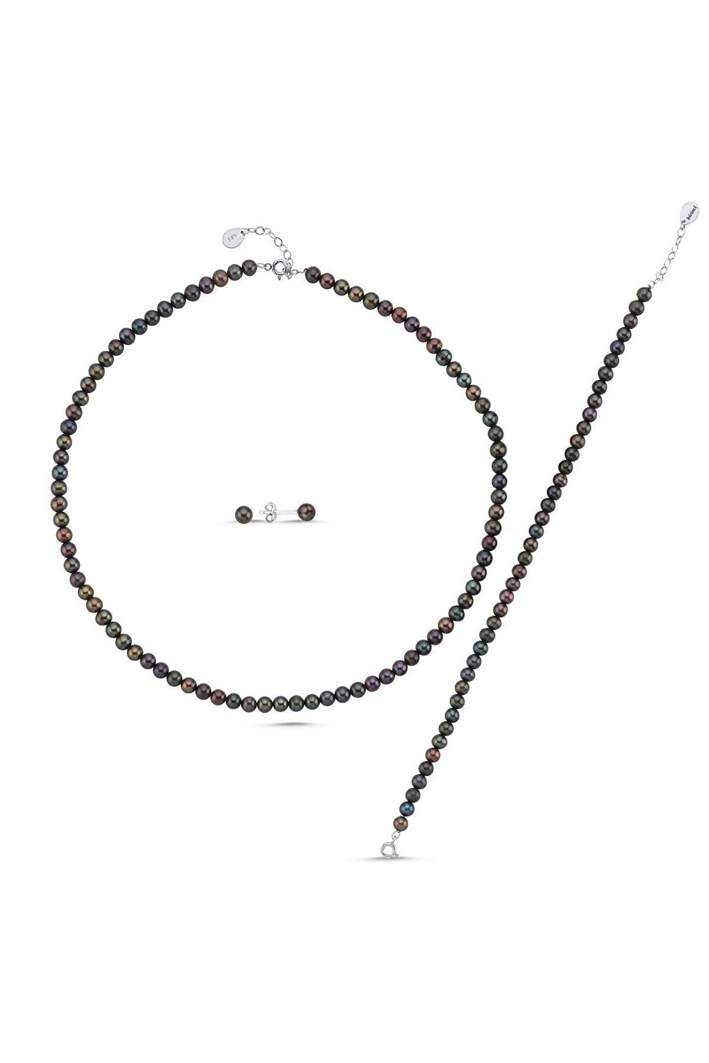 14 Ayar Altın 5 mm Siyah Doğal İnci Kolye Bileklik Küpe Üçlü Set