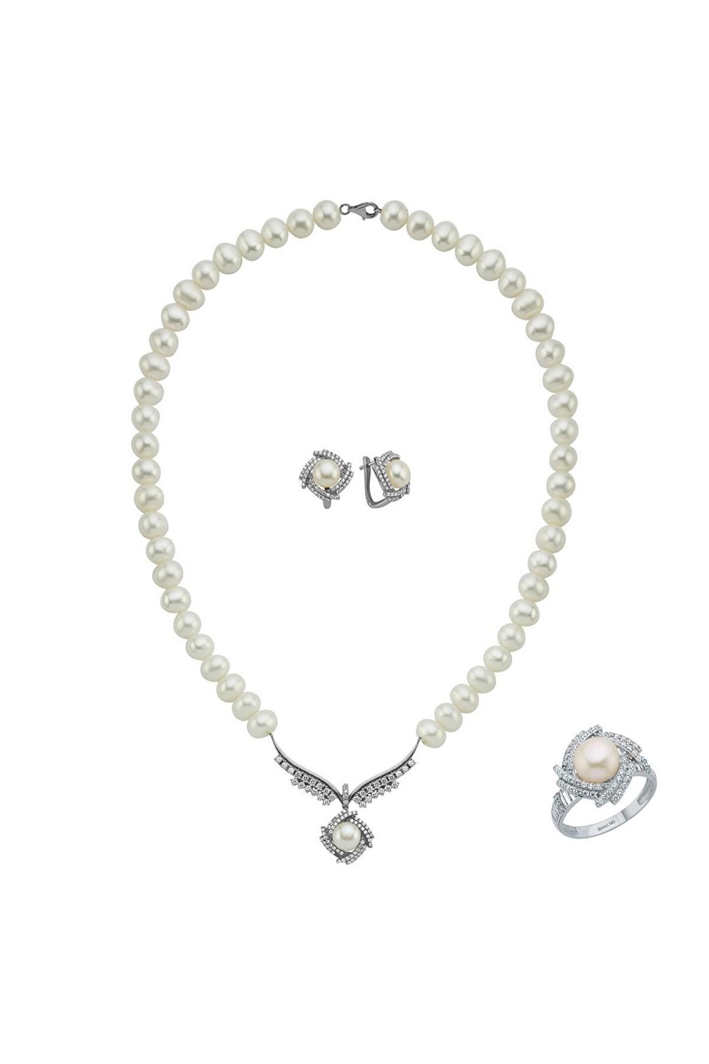 14 Ayar Altın 6 mm Rüzgar Gülü Doğal İnci Küpe Kolye Yüzük Üçlü Set