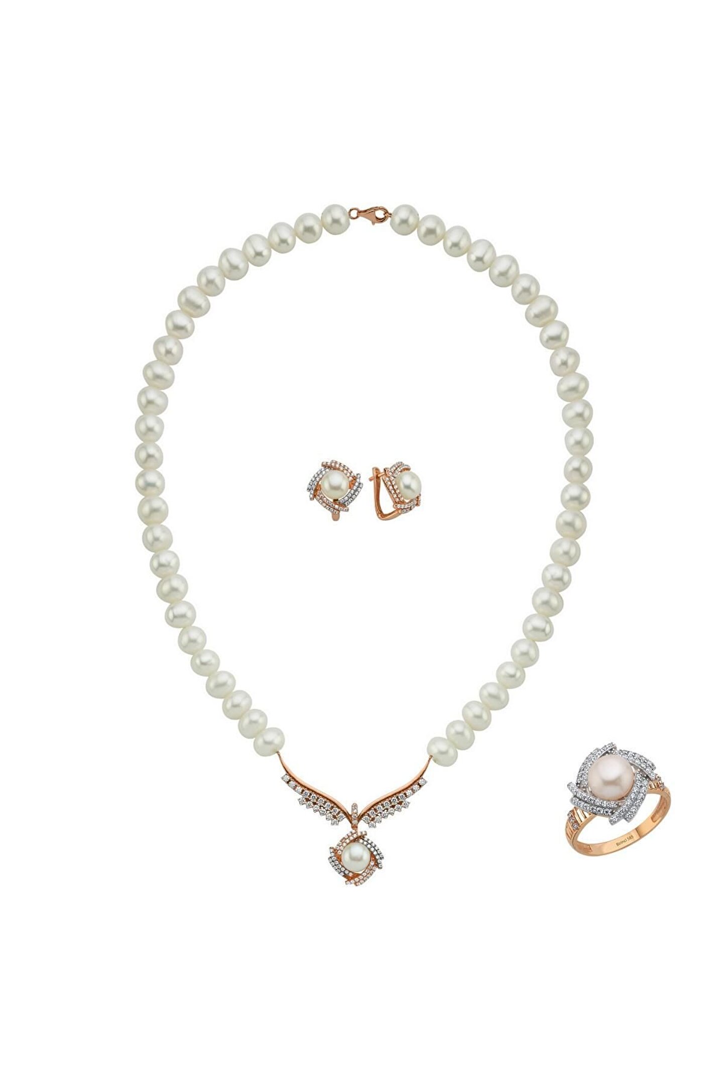 14 Ayar Altın 6 mm Rüzgar Gülü Doğal İnci Küpe Kolye Yüzük Üçlü Set