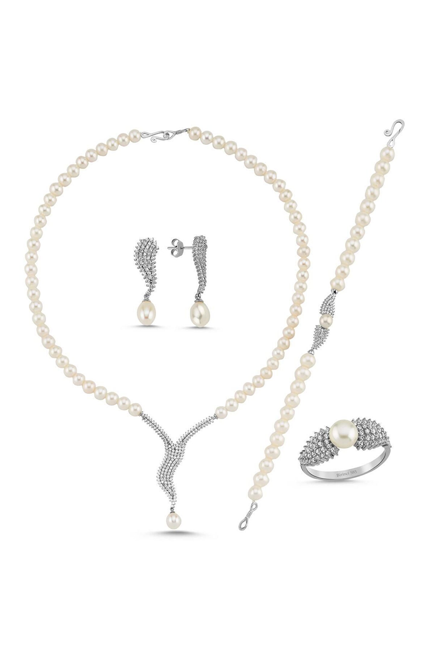 14 Ayar Altın 7 mm Su Yolu Taşlı Doğal İnci Küpe Kolye Bileklik Yüzük Dörtlü Set