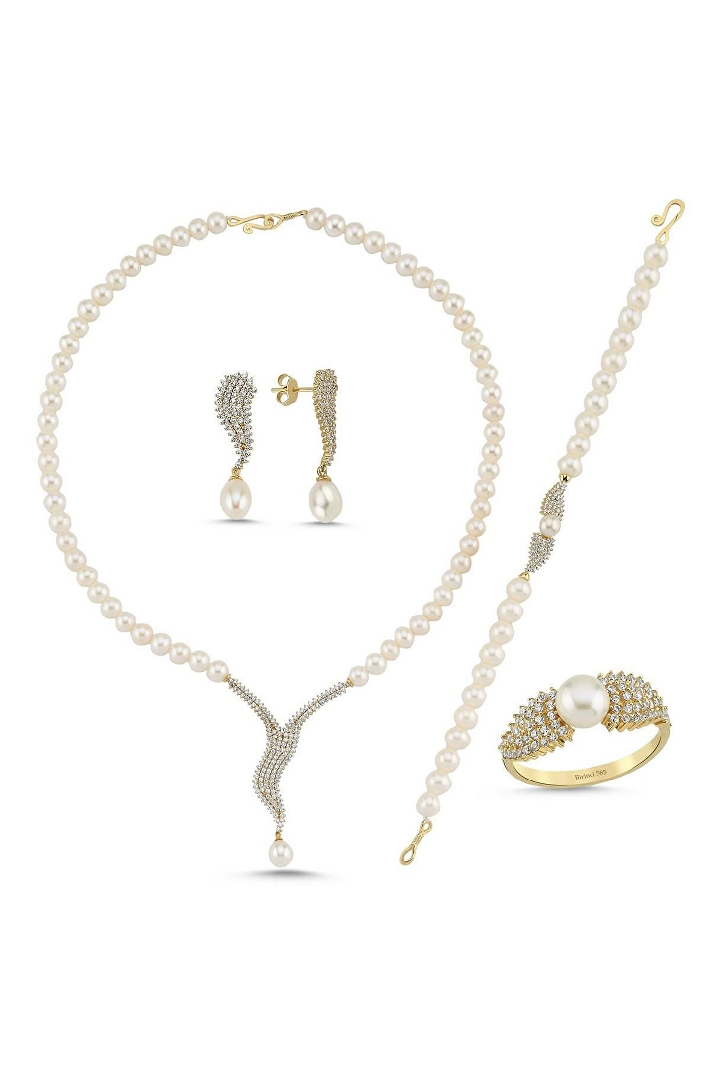 14 Ayar Altın 7 mm Su Yolu Taşlı Doğal İnci Küpe Kolye Bileklik Yüzük Dörtlü Set