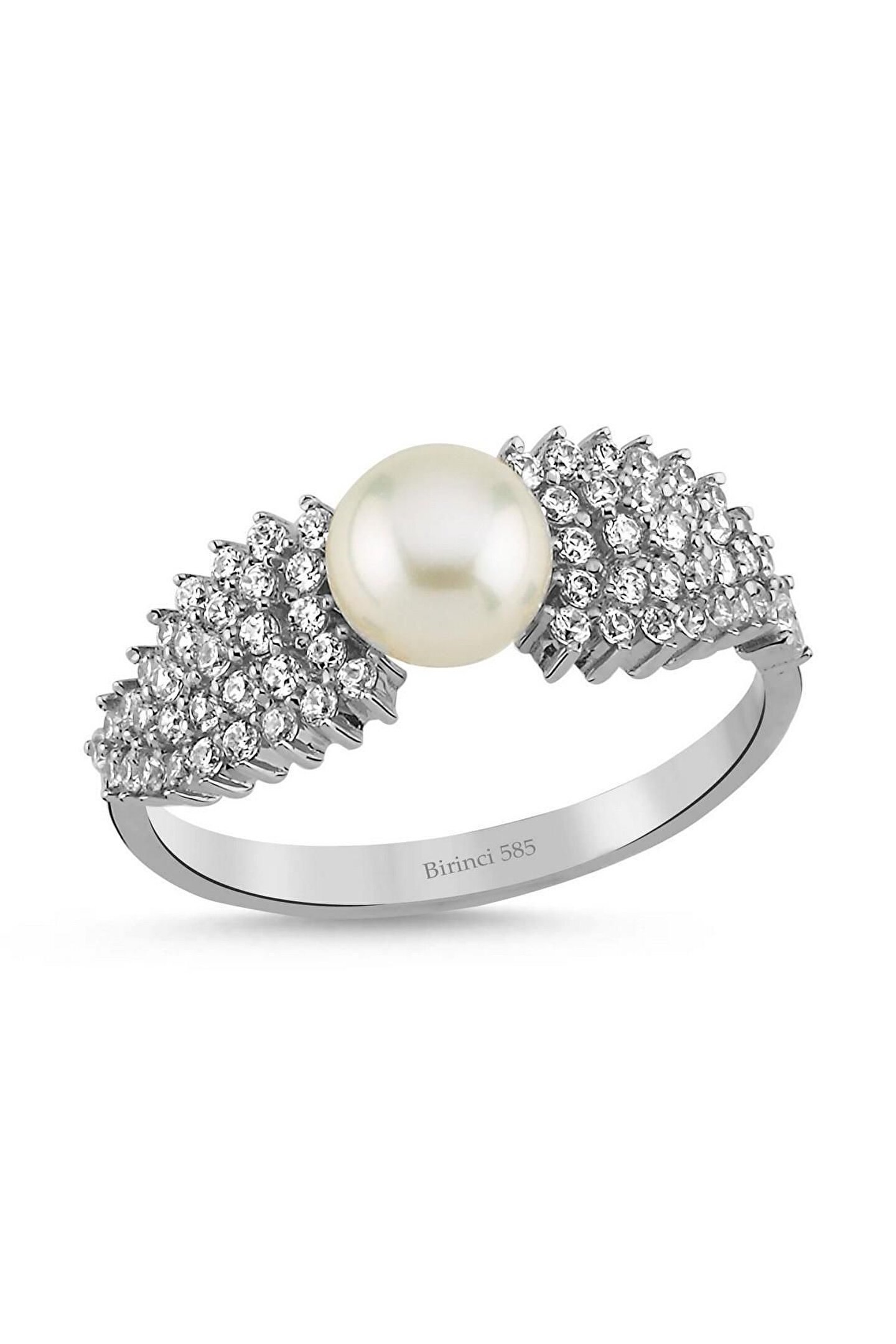 14 Ayar Altın 7 mm Zirkon Taşlı Doğal İnci Yüzük