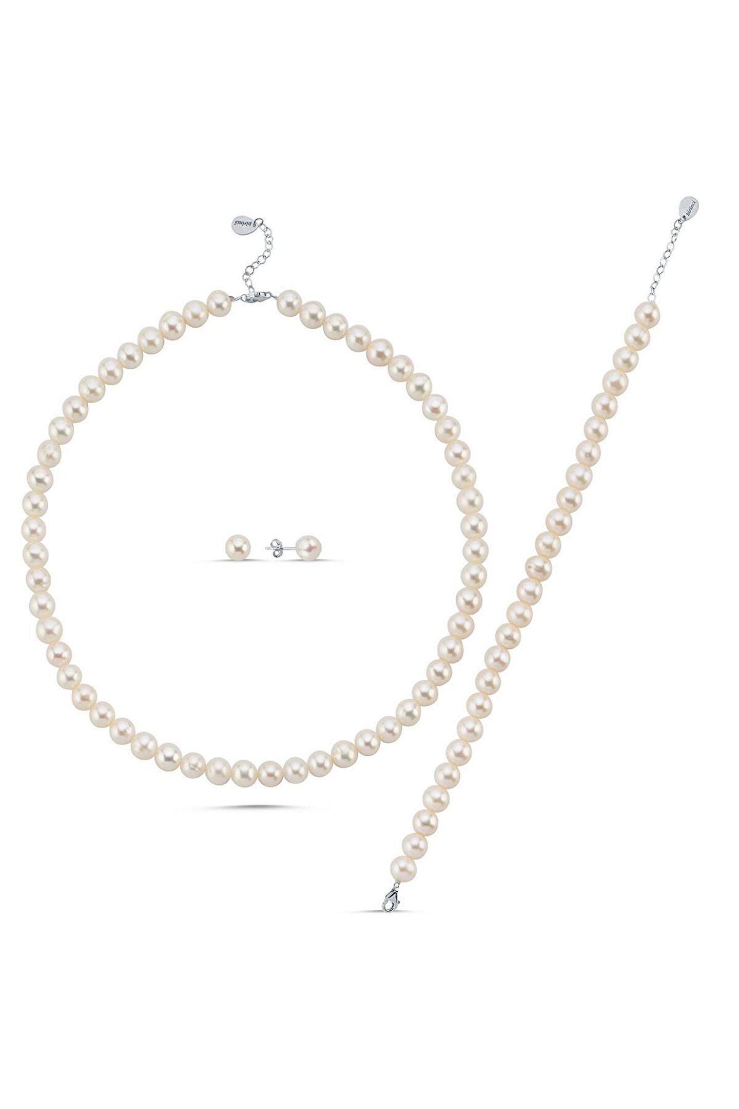 14 Ayar Altın 8 mm Sıralı Doğal İnci Kolye Bileklik Küpe Üçlü Set