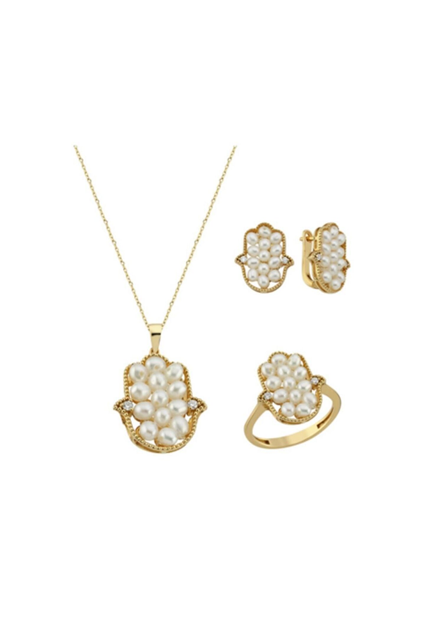 14 Ayar Altın Fatma Elli Doğal İnci 0,15 Ct Pırlanta Küpe Kolye Yüzük Üçlü Set