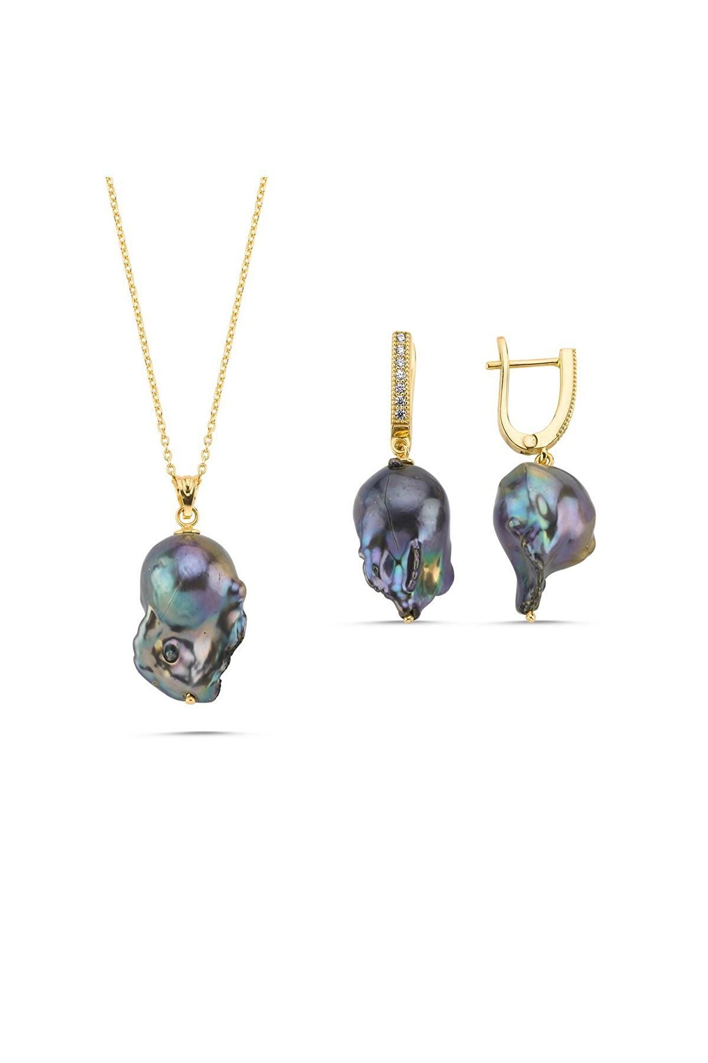 14 Ayar Altın Siyah Barok İnci Kolye Küpe İkili Set