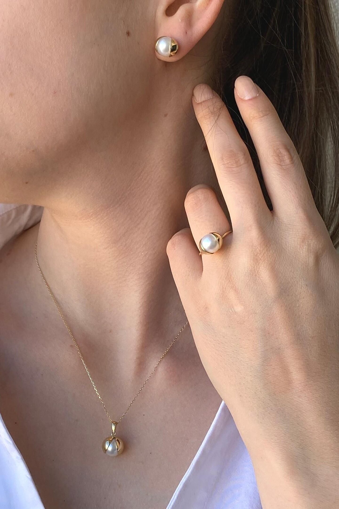 14 Ayar Altın 10 Mm Doğal Inci Küpe Kolye Yüzük Üçlü Set