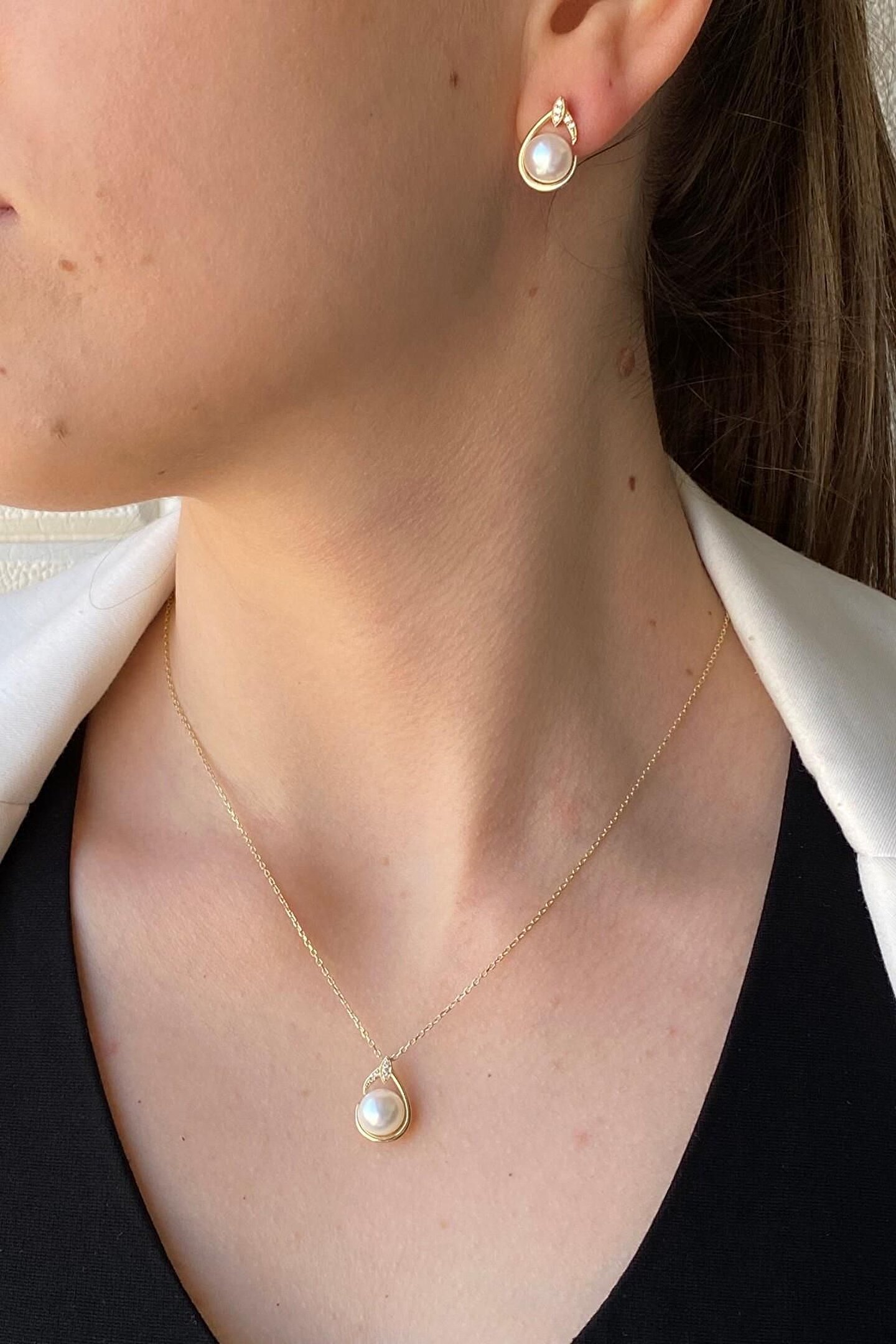 14 Ayar Altın 6 Mm Damla Doğal Inci Küpe Kolye Ikili Set
