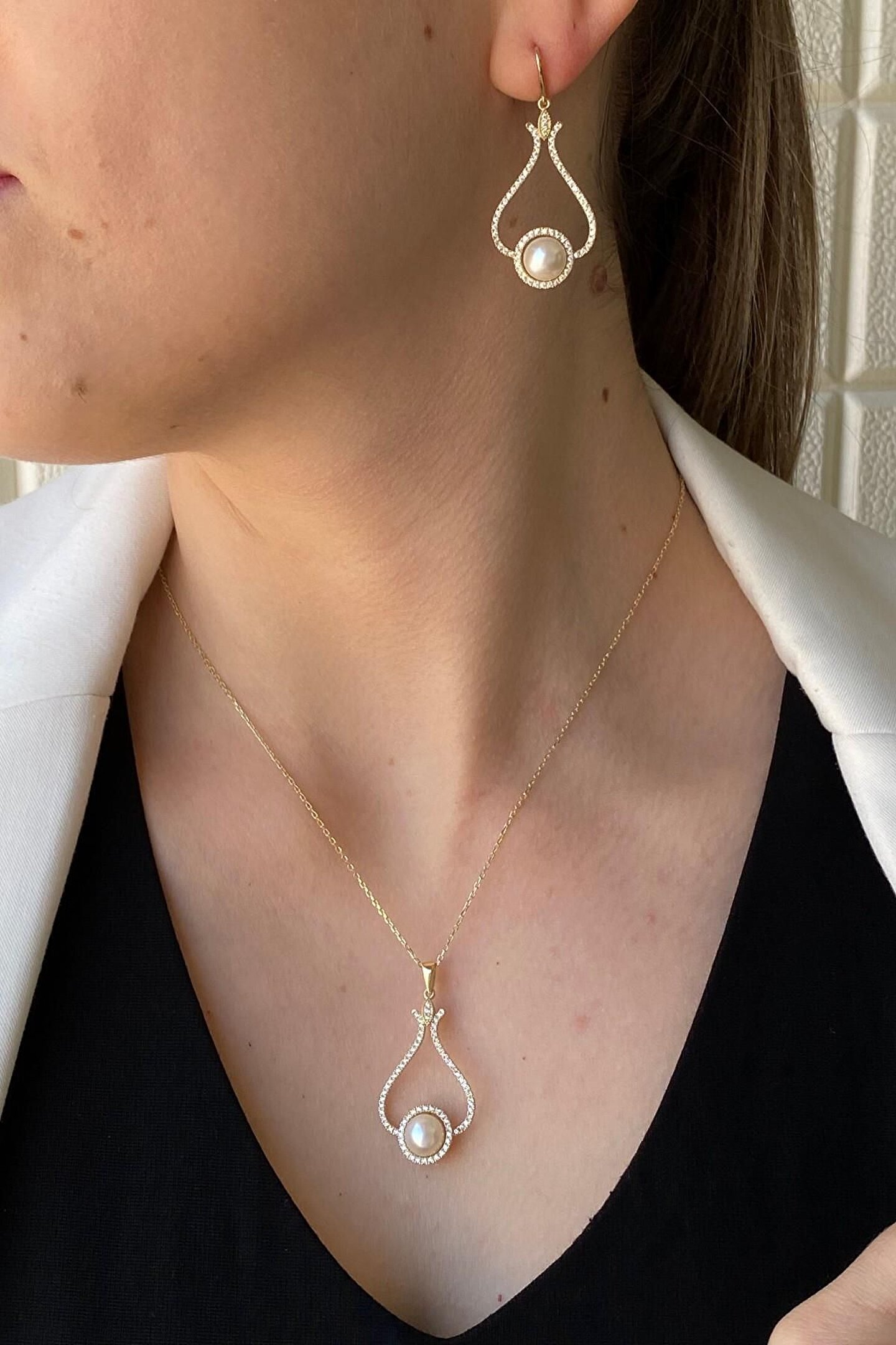 14 Ayar Altın 6 Mm Lale Taşlı Doğal Inci Küpe Kolye Ikili Set