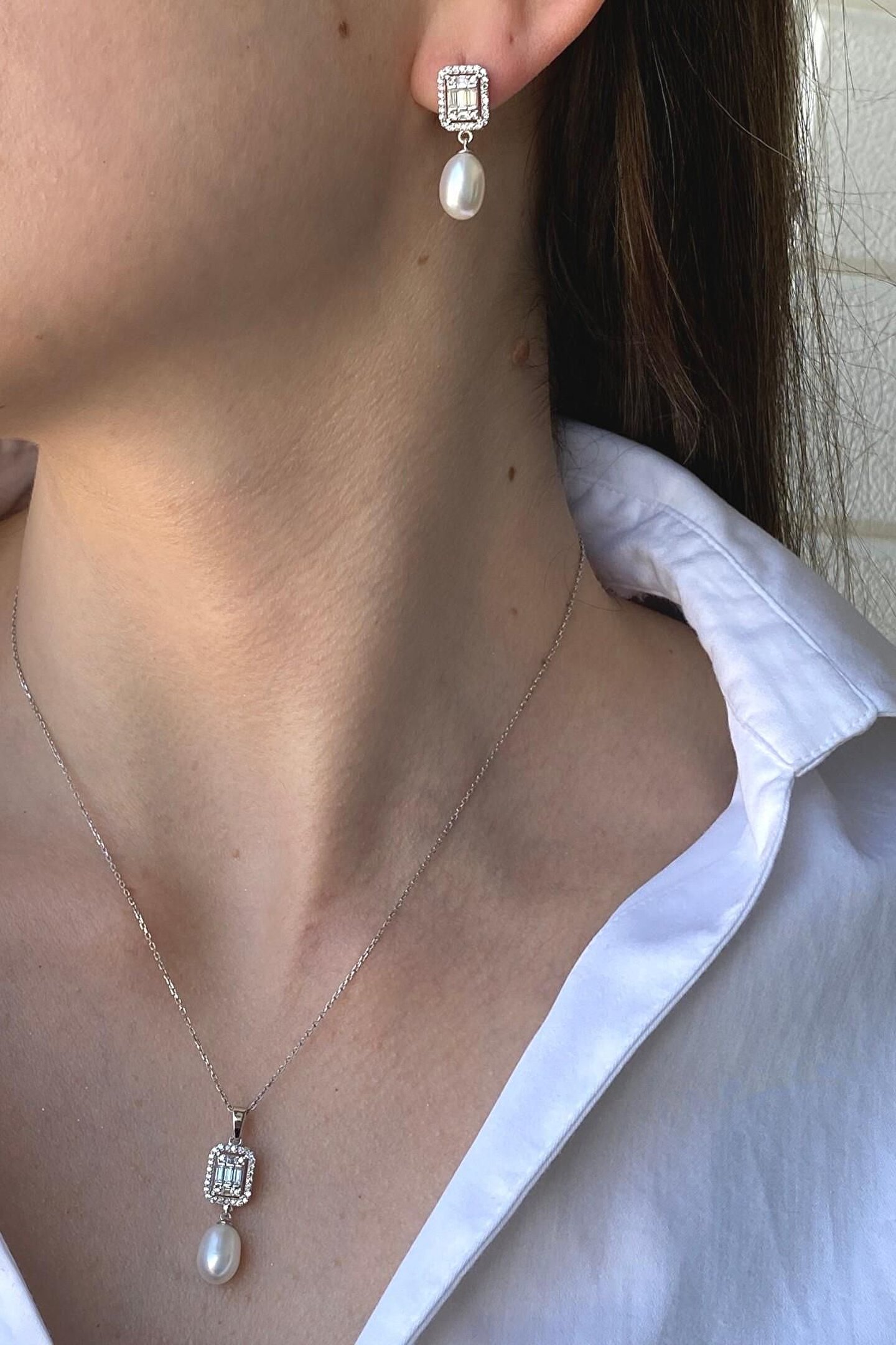 14 Ayar Altın 9 Mm Baget Taşlı Doğal Inci Sallantı Küpe Kolye Ikili Set