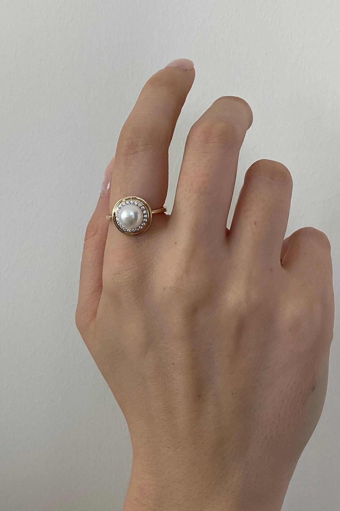 14 Ayar Altın Doğal Incili Zirkon Taşlı Yüzük