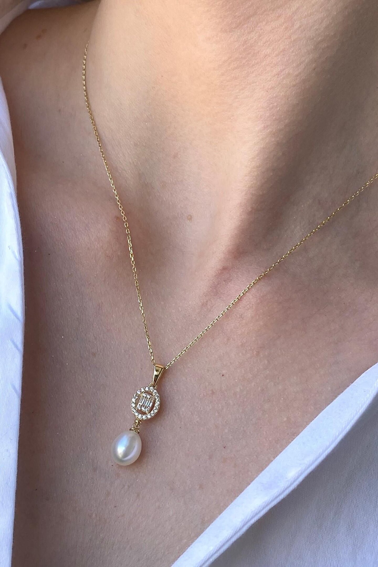 14 Ayar Altın Kadın Oval Baget Taşlı Doğal Inci Sallatı Kolye