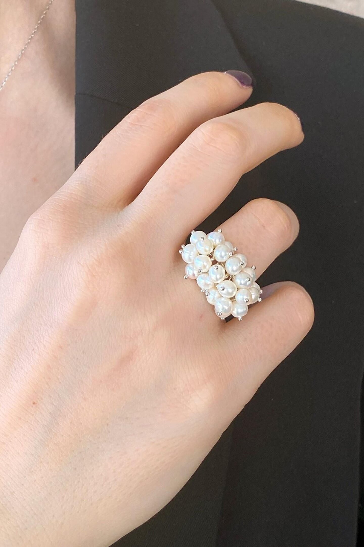 14 Ayar Beyaz Altın Kadın Üzümlü Beyaz Gerçek Inci Yüzük
