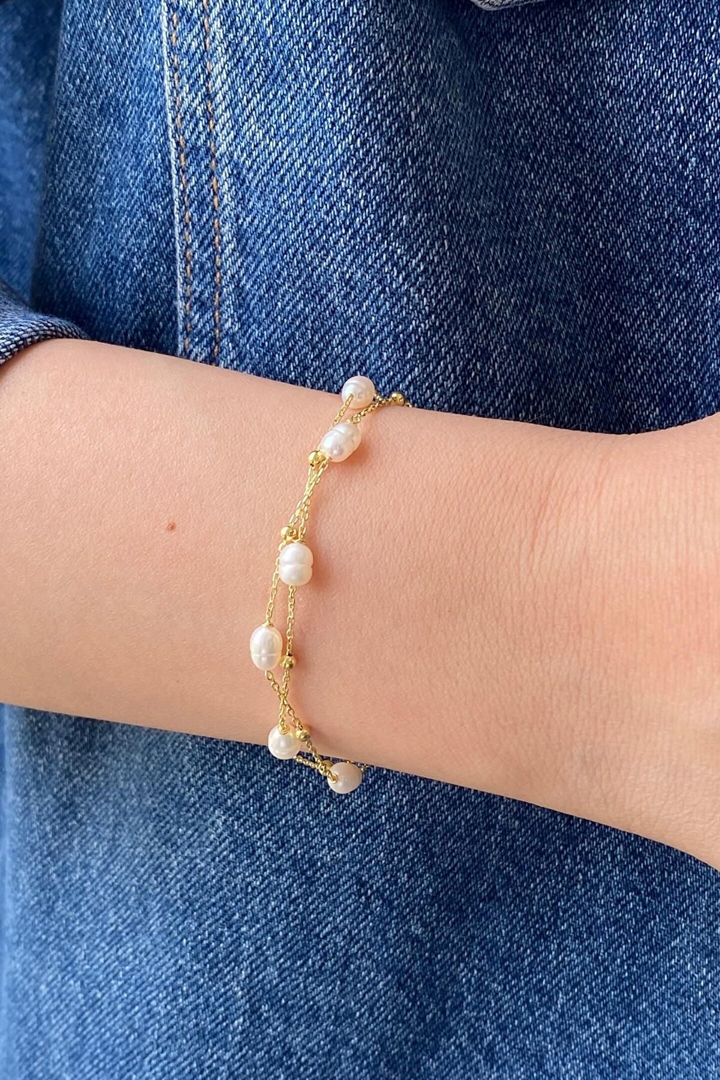 925 Ayar Gümüş Çift Zincir Dorika Toplu Doğal Inci Kadın Bileklik