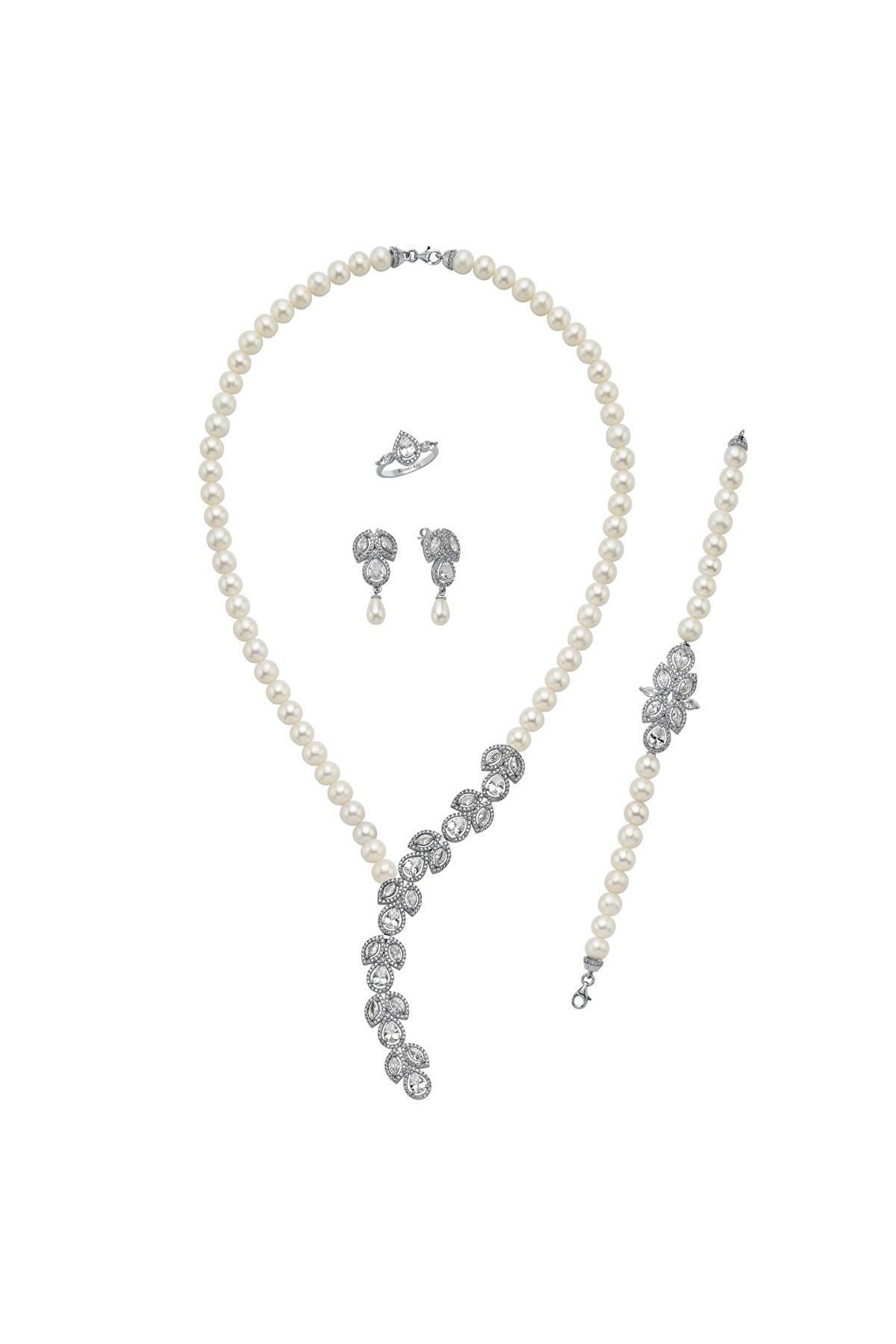 925 Ayar Gümüş Kadın Doğal Inci Küpe Kolye Bileklik Yüzük Dörtlü Set