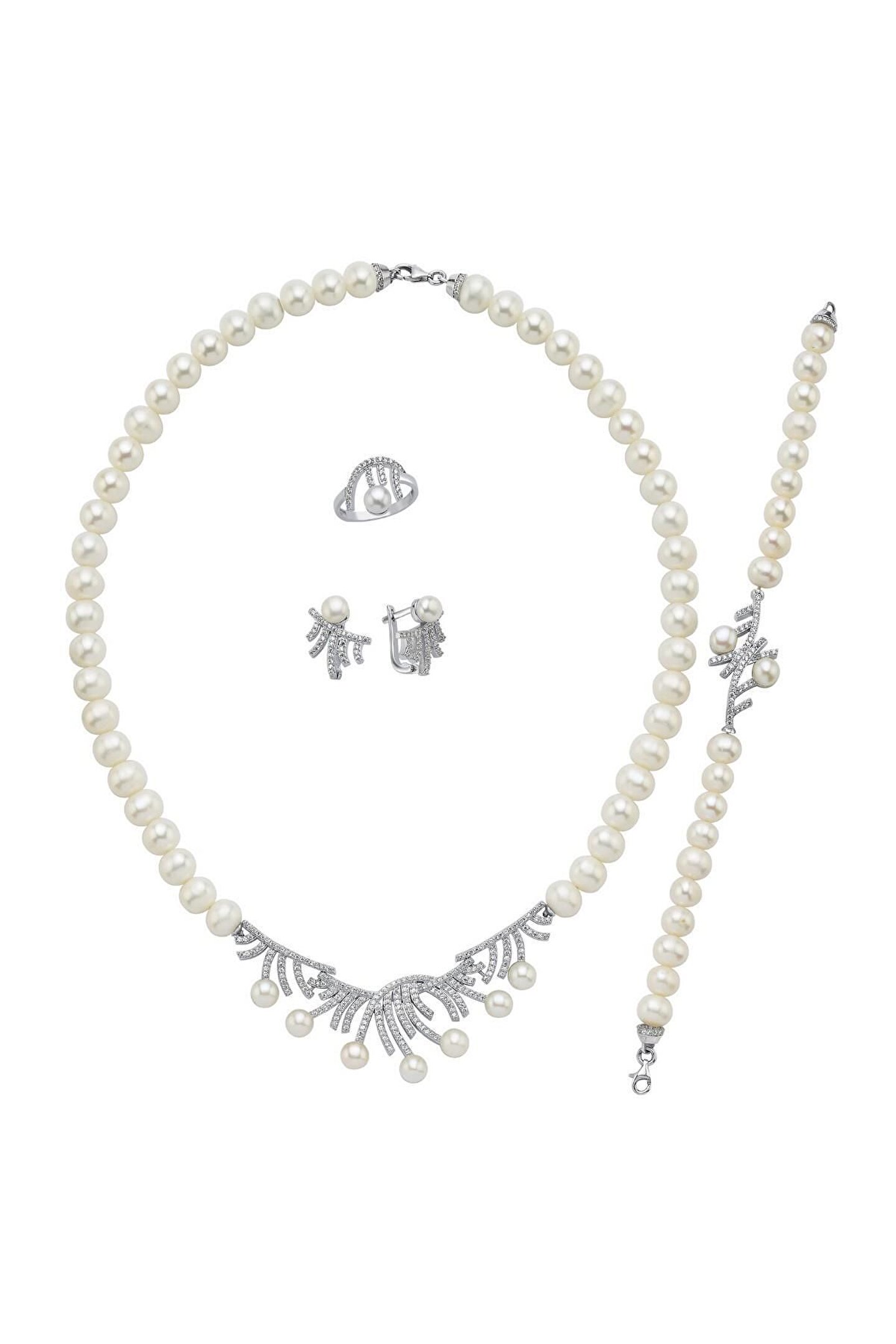 925 Ayar Gümüş Kadın Zirkon Taşlı Çubuk Figürlü Doğal Inci Küpe Kolye Bileklik Yüzük Dörtlü Set