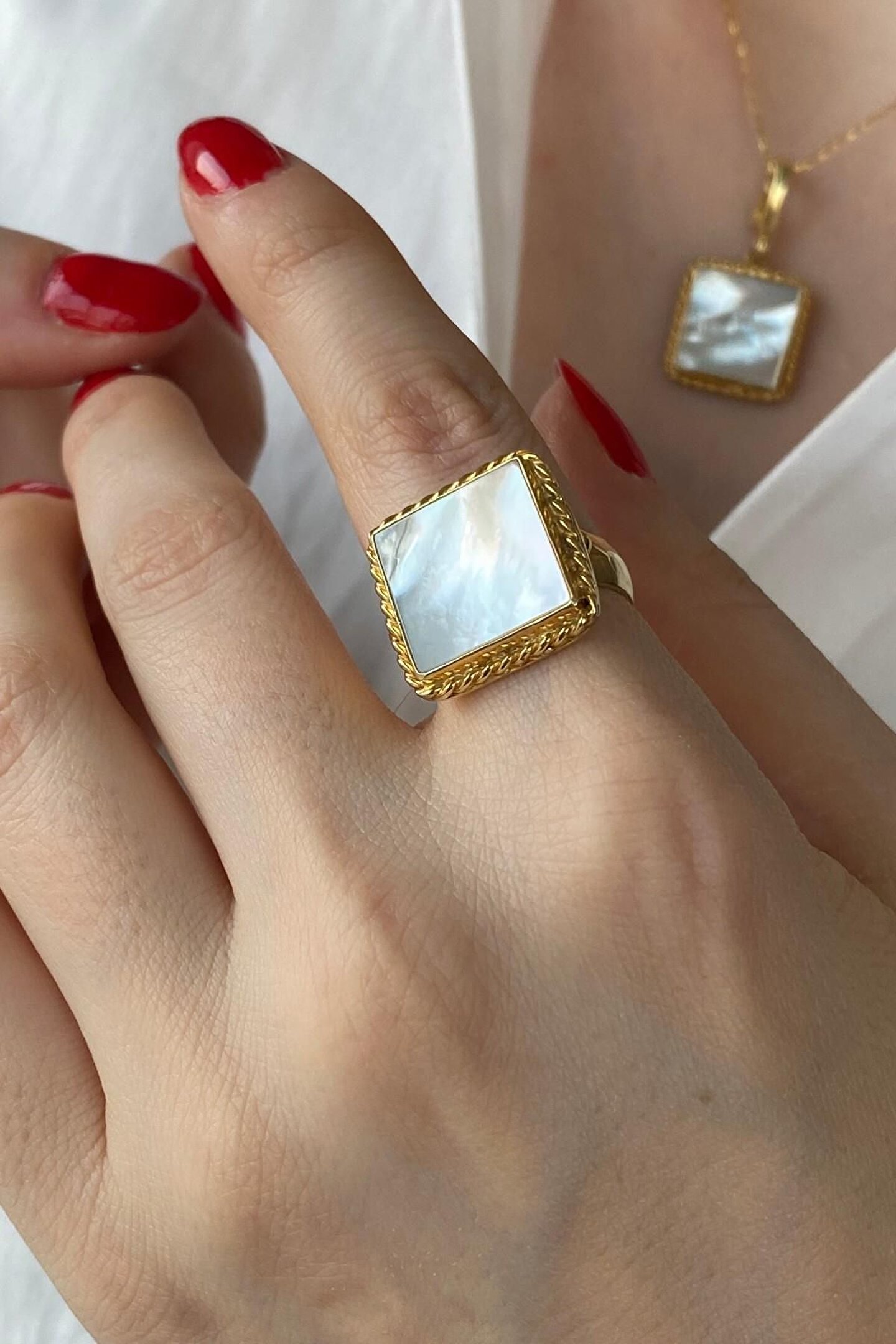 925 Ayar Gümüş Vintage Mother Of Pearl Sedefli Kare Yüzük
