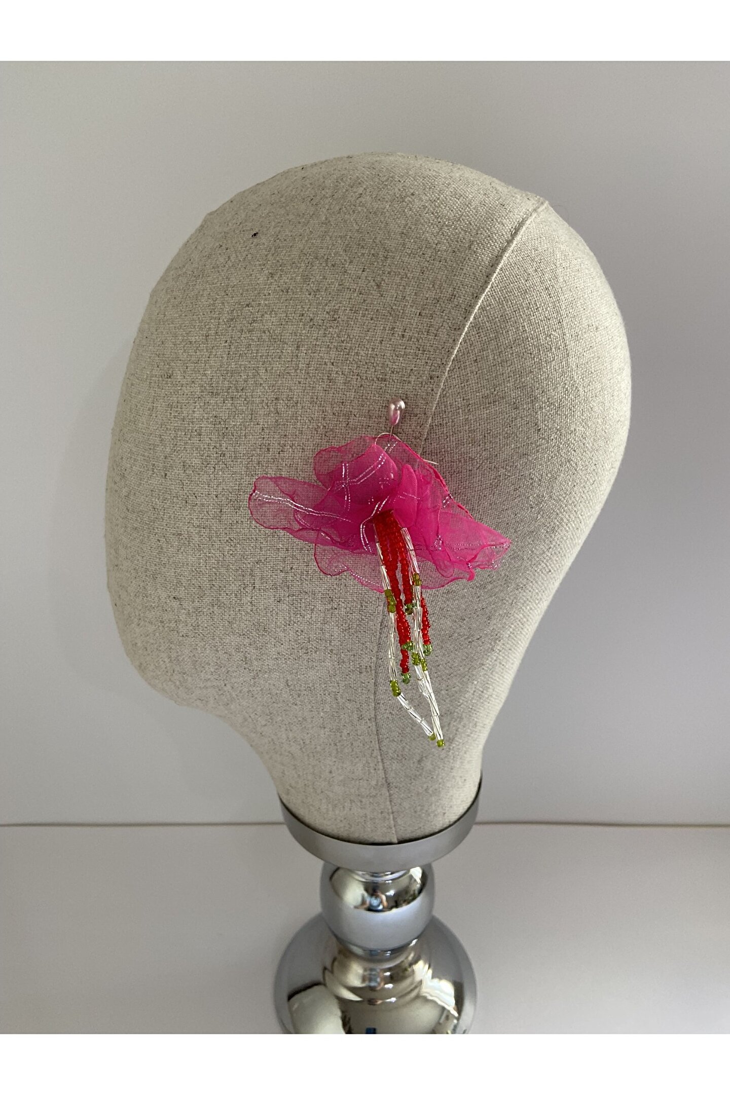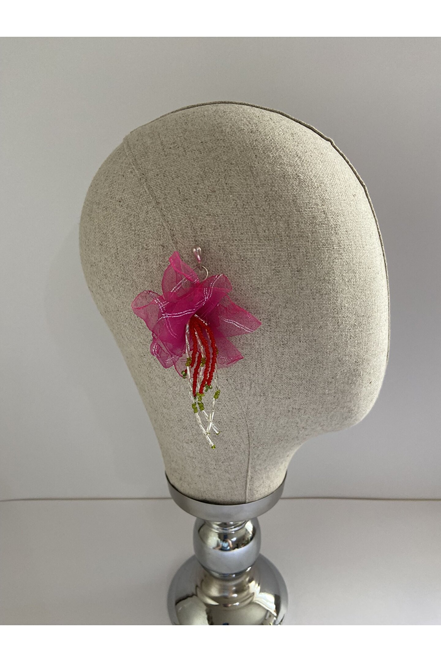 Cemil İpekçi'nin özel defilesi için tasarlanmış bu şık küpe seti, zarafeti ve modern estetiği bir araya getiriyor. Eşsiz pembe tül detayları, kırmızı ve beyaz kum boncuk sallantılarıları ile bezeli bu küpeler, göz alıcı renklerin ve dokuların harmanlanmasını sunarak her tarza mükemmel bir uyum sağlar.