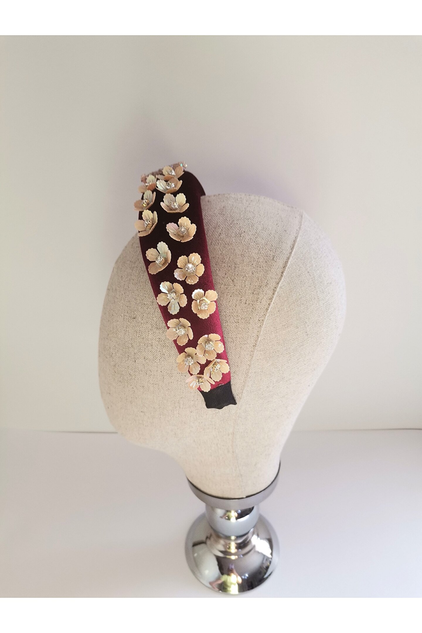 Cemil İpekçi defilesi için özel olarak tasarlanan bu zarif taç, kırmızı kadife kumaşıyla şıklığı ve zarafeti bir araya getiriyor. Bir tarafında çiçek motifli boncuklar ve parlak detaylar, diğer tarafında ise cam ve ışıltılı boncuklarla yapılan işlemelerle süslenmiştir. Özel günlerde veya günlük kullanımlarda stilinize şıklık katacak bu taç, her tarza uyum sağlayarak dikkatleri üzerinize çekecek. Kendinizi özel hissetmek için ideal bir aksesuar!
