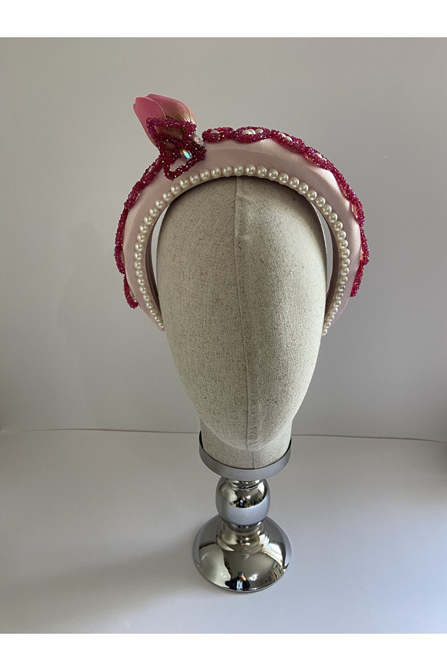 Cemil İpekçi defilesi için özel olarak tasarlanan bu zarif taç, pembe kadife kumaşıyla şıklığı ve zarafeti bir araya getiriyor. Bir tarafında çiçek motifi ve parlak detaylar, diğer tarafında ise cam ve ışıltılı boncuklarla yapılan işlemelerle süslenmiştir. Özel günlerde veya günlük kullanımlarda stilinize şıklık katacak bu taç, her tarza uyum sağlayarak dikkatleri üzerinize çekecek. Kendinizi özel hissetmek için ideal bir aksesuar!