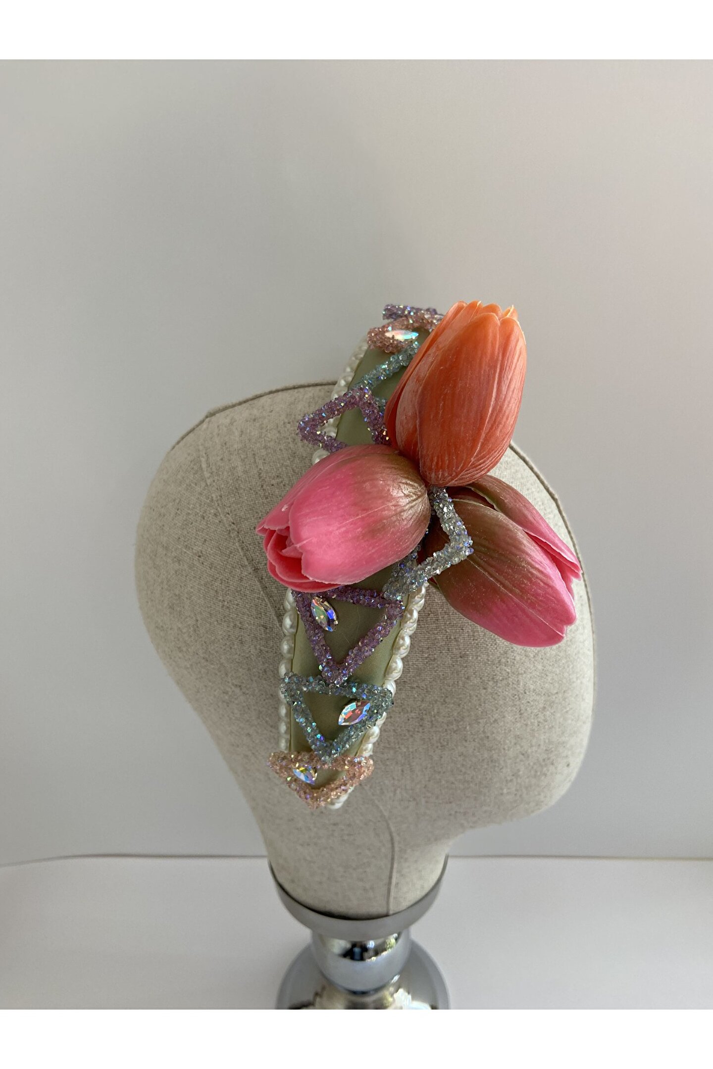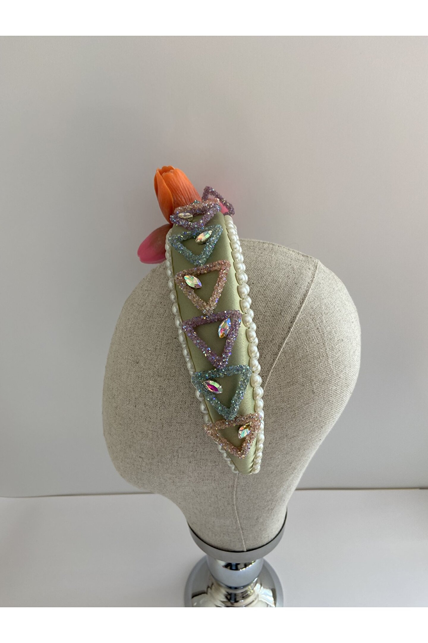 Cemil İpekçi defilesi için özel olarak tasarlanan bu zarif taç, soft yeşil kadife kumaşıyla şıklığı ve zarafeti bir araya getiriyor. Bir tarafında pembe çiçek motifi ve parlak detaylar, diğer tarafında ise cam ve ışıltılı boncuklarla yapılan işlemelerle süslenmiştir. Özel günlerde veya günlük kullanımlarda stilinize şıklık katacak bu taç, her tarza uyum sağlayarak dikkatleri üzerinize çekecek. Kendinizi özel hissetmek için ideal bir aksesuar!