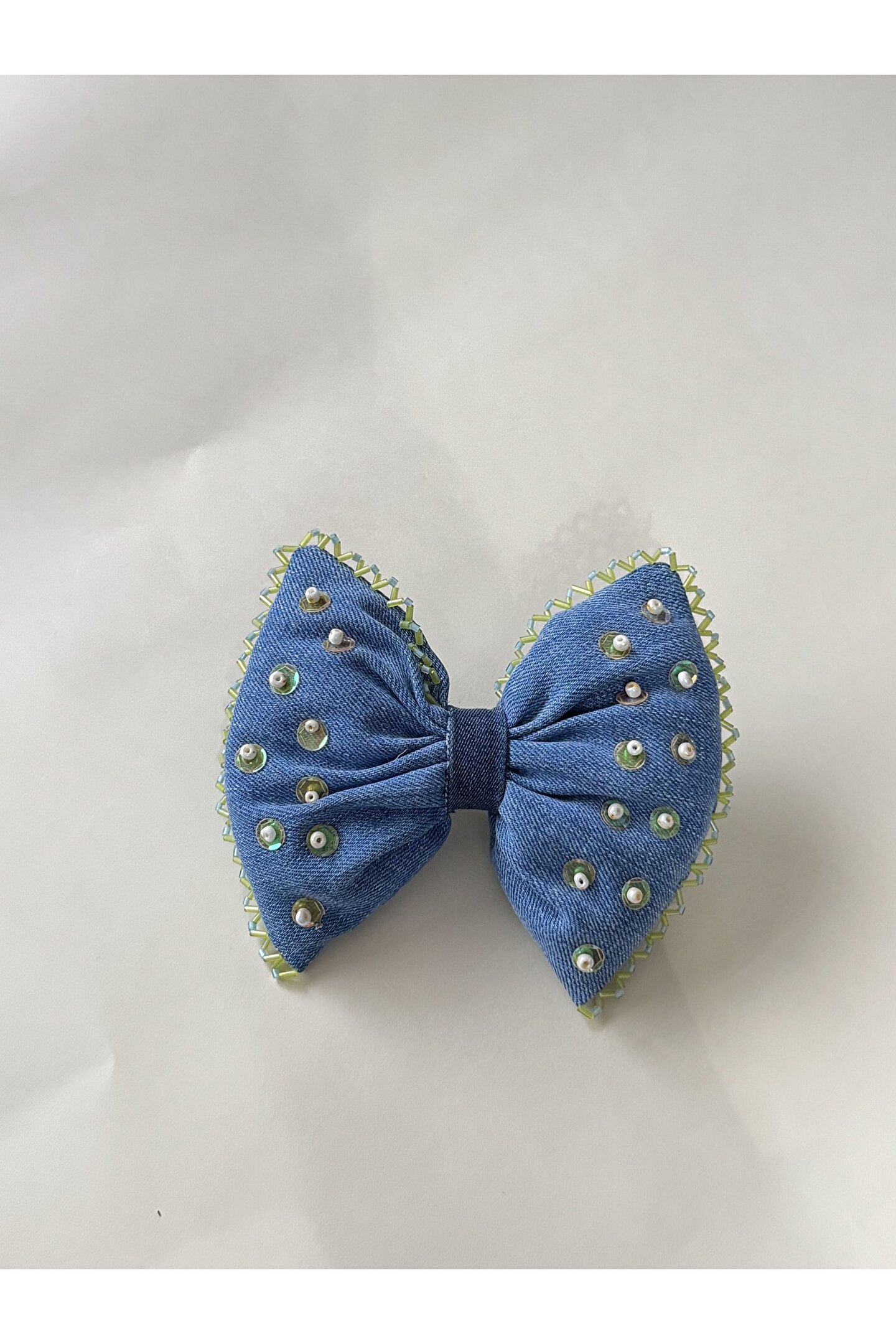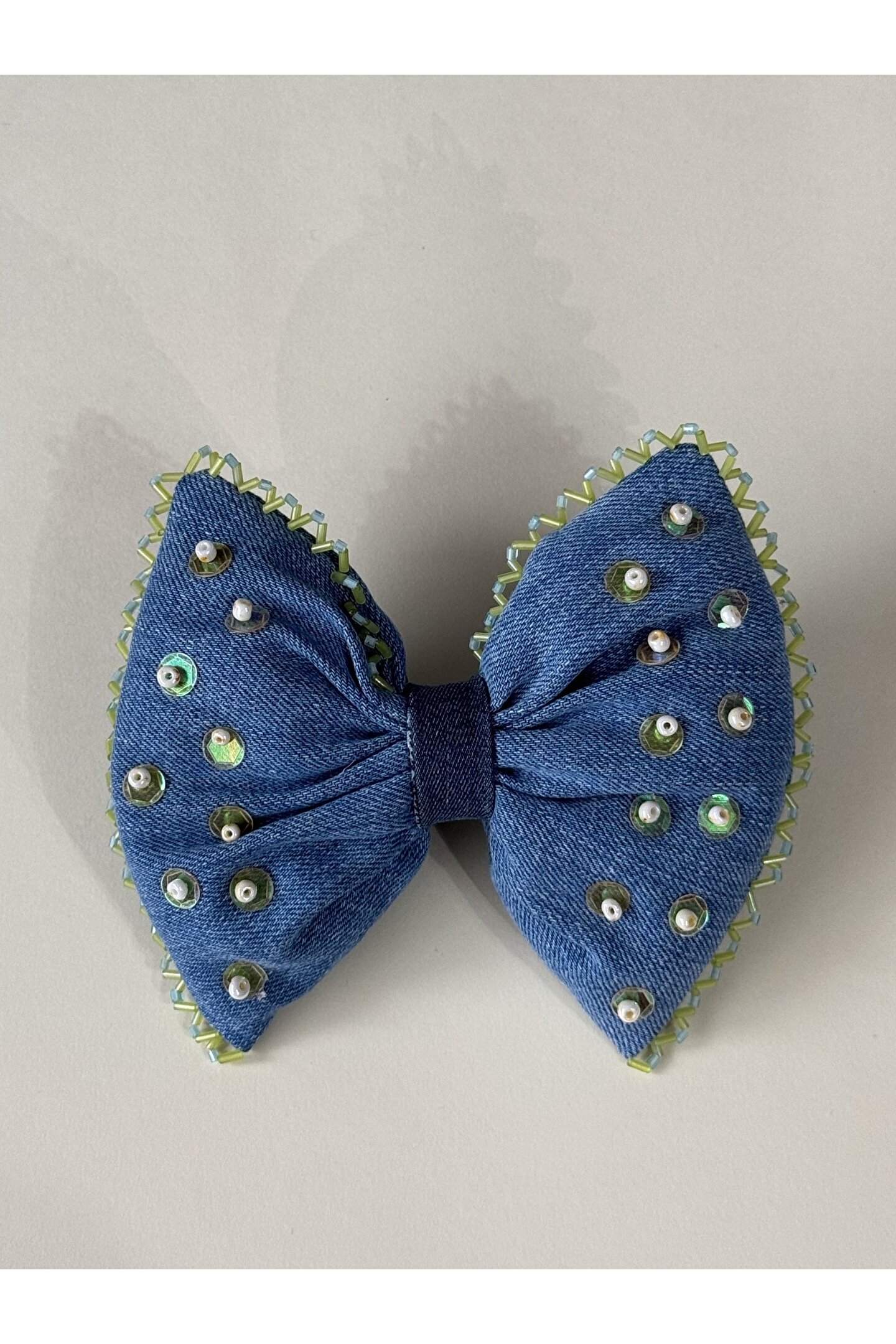 • Kumaş üzerine cam ve kum boncuk işlemeli özel tasarım otomatik fiyonk toka.