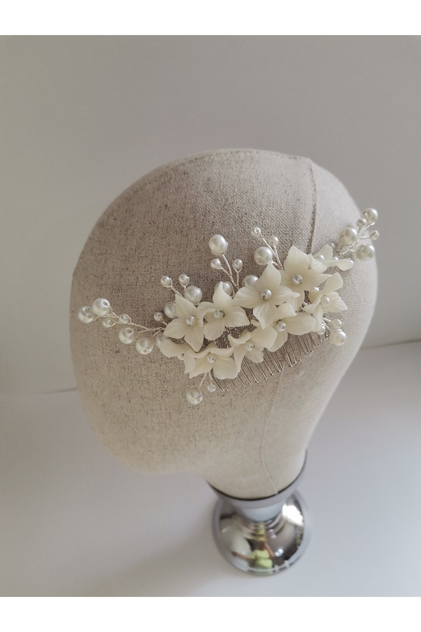 • Çiçek taneleri ve inci boncuklar ile hazırlanmış özel tasarım saç tarağı ve küpe seti.