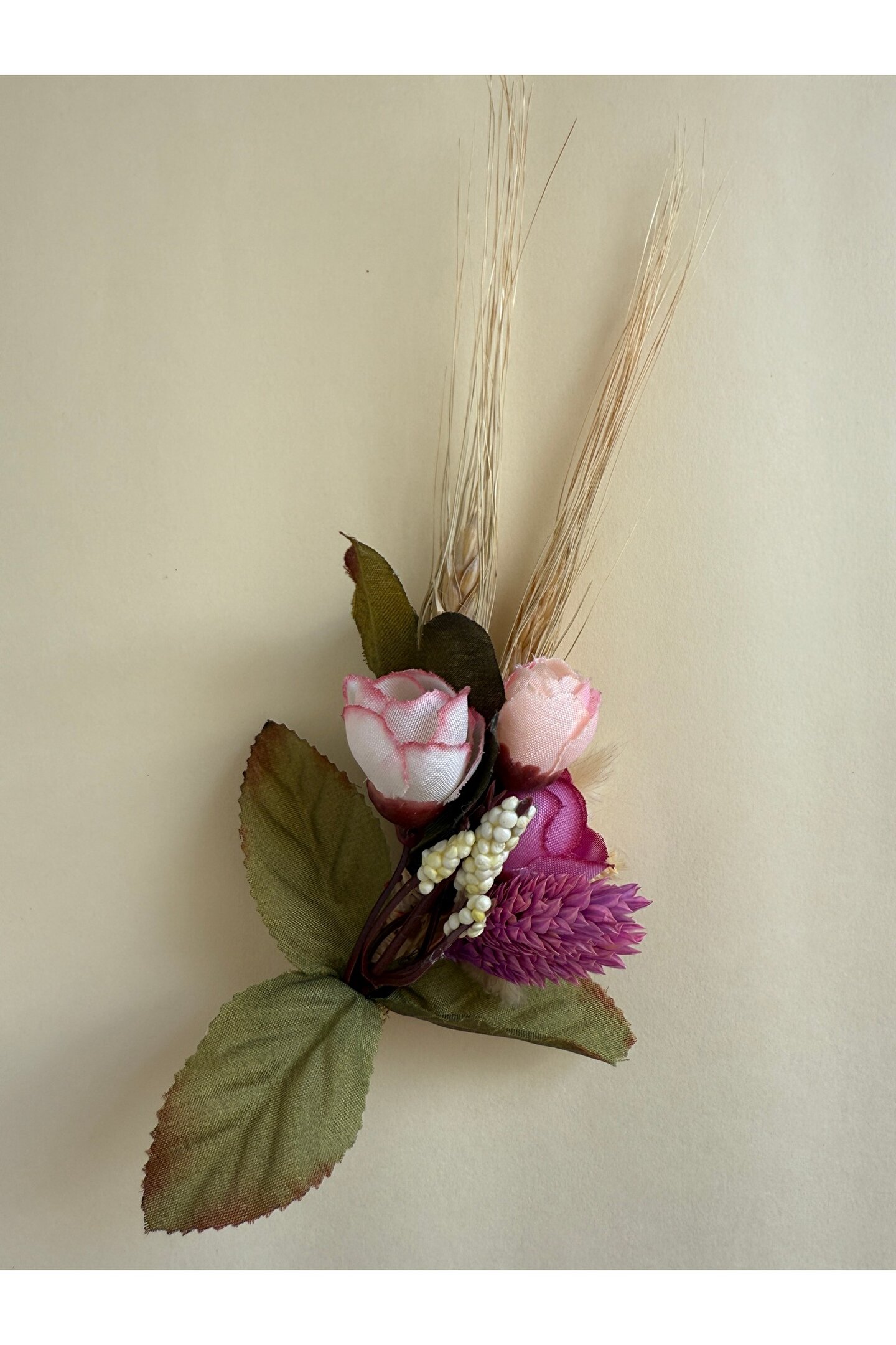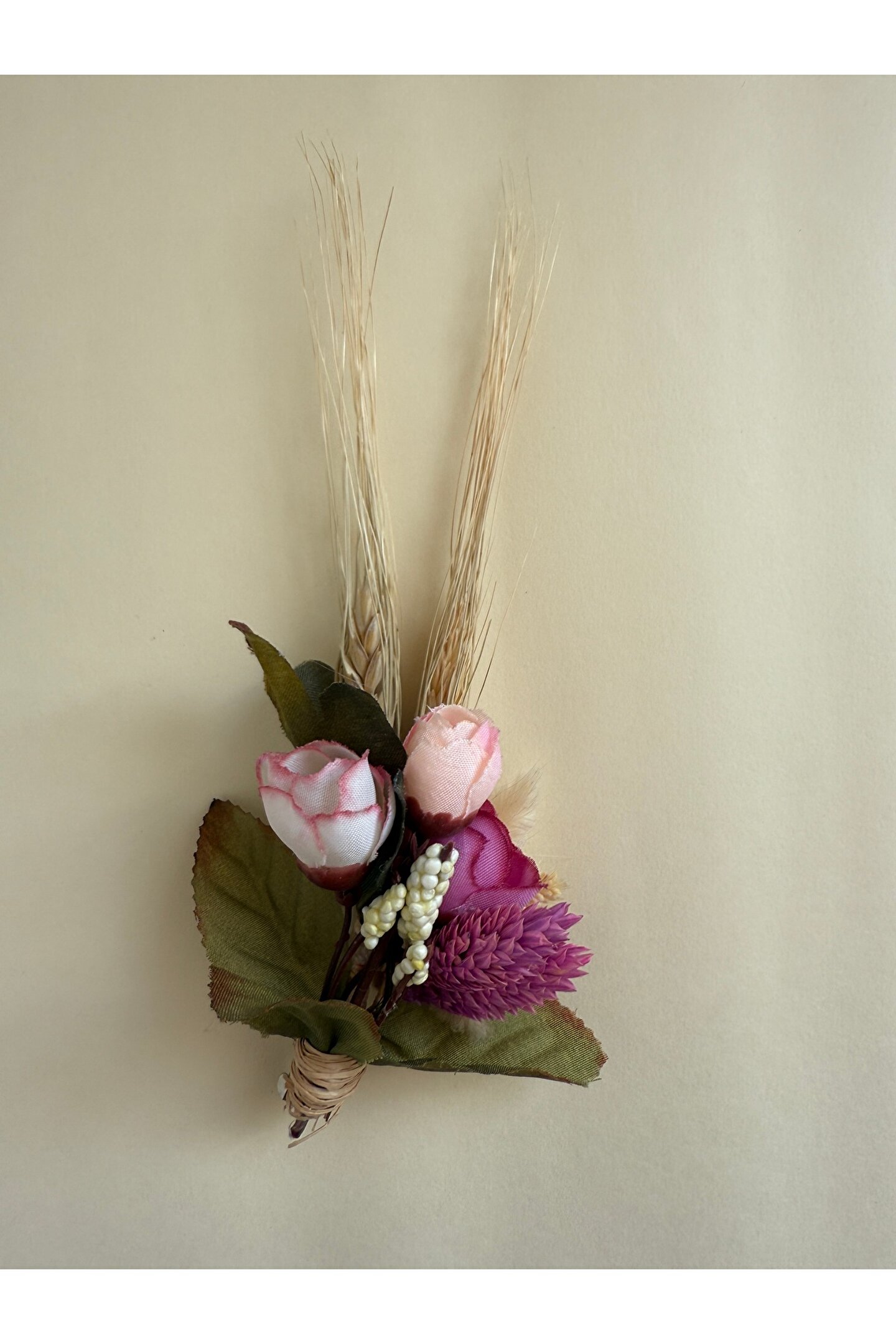 İthal kuru çiçekler ve yapay çiçekler ile hazırlanan özel tasarım damat yaka çiçeği