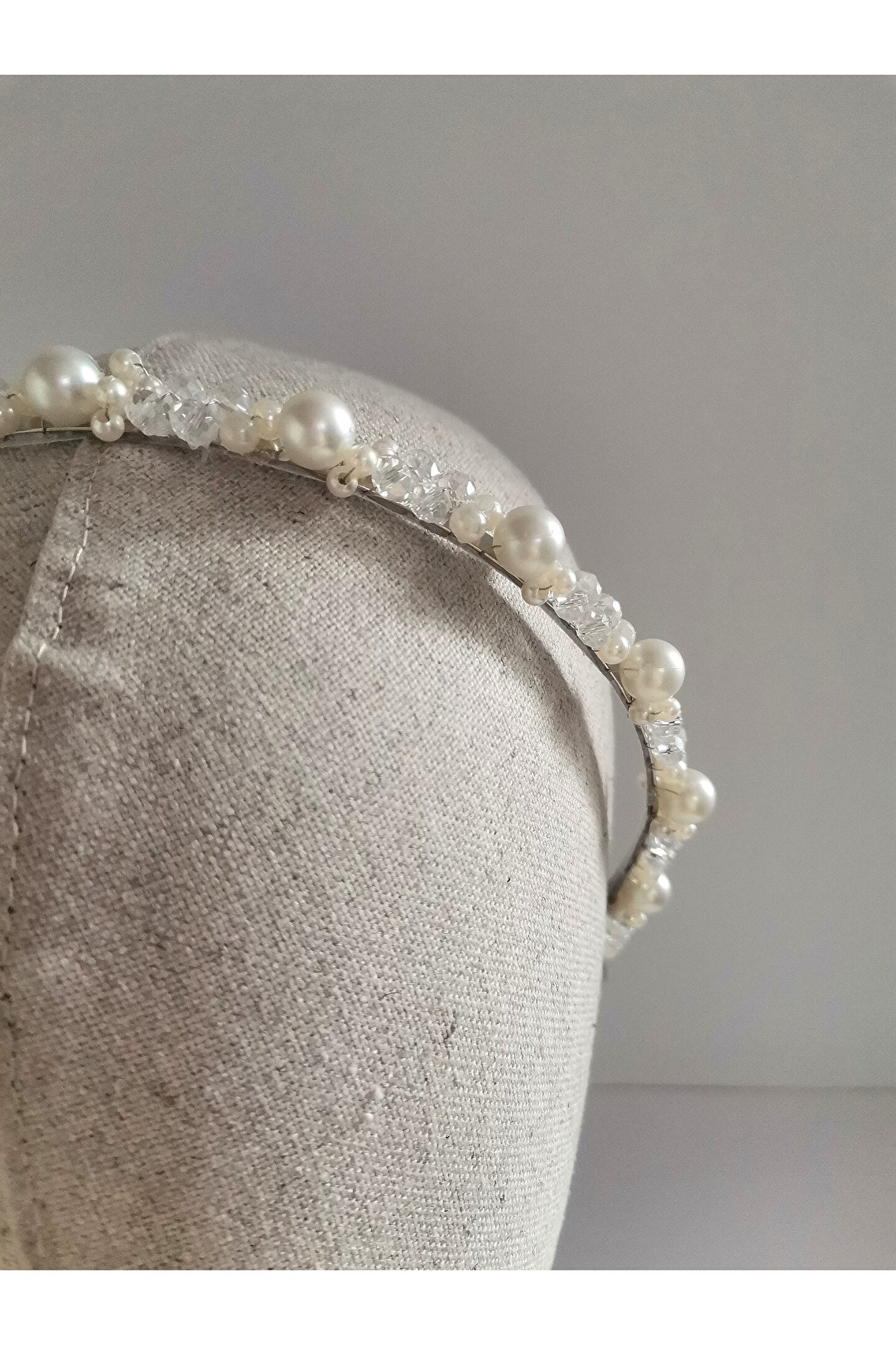 Büyük inci boncuklar, kum boncuklar ve parlak kristal boncuklarla özenle hazırlanmış bu özel tasarım taç, zarif ve dikkat çekici bir aksesuar olarak her ortamda fark yaratır.; El yapımı bu taç, incilerin sofistike ışıltısı ve kristal boncukların parlaklığıyla harmanlanarak hem klasik hem de modern tarzlara uyum sağlar.; Düğün, nişan, özel davetler gibi unutulmaz anlarınızda görünümünüze zarafet katarken, günlük kullanımlar için de ideal bir tercih olabilir.; Her detayı titizlikle işlenmiş olan bu taç, stilinizi tamamlayan şık bir dokunuş sunuyor.
