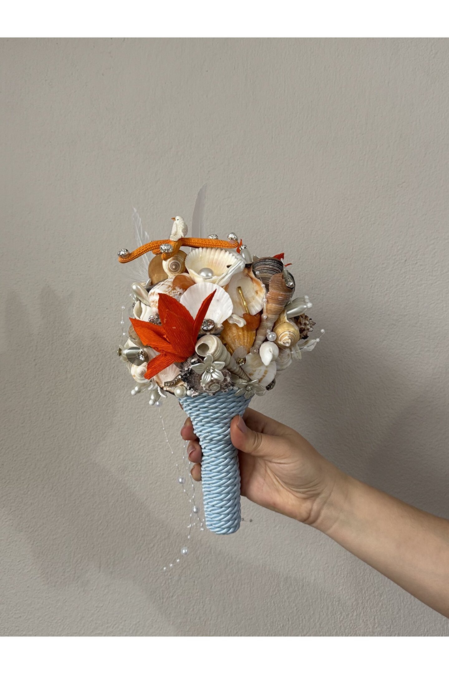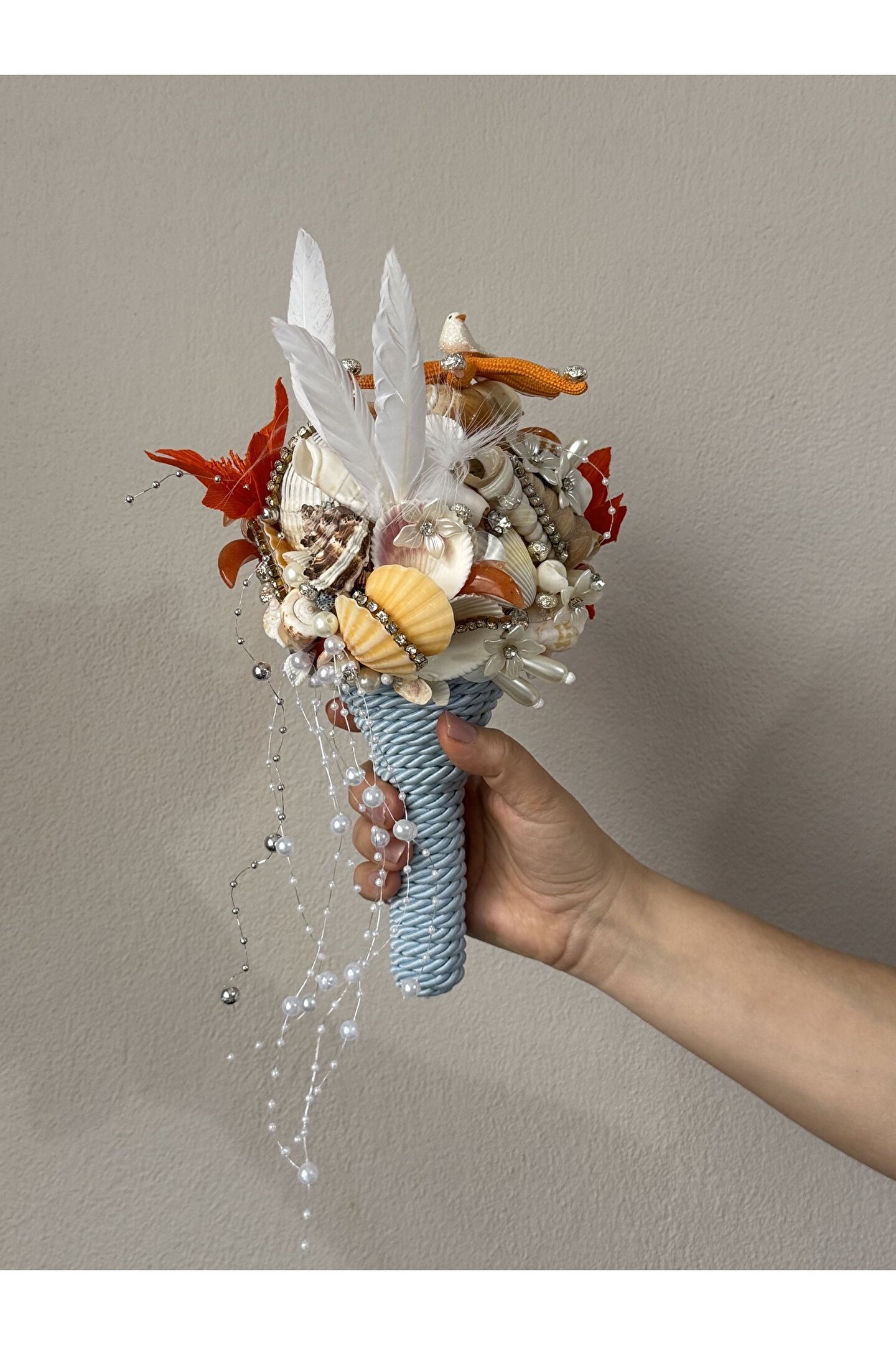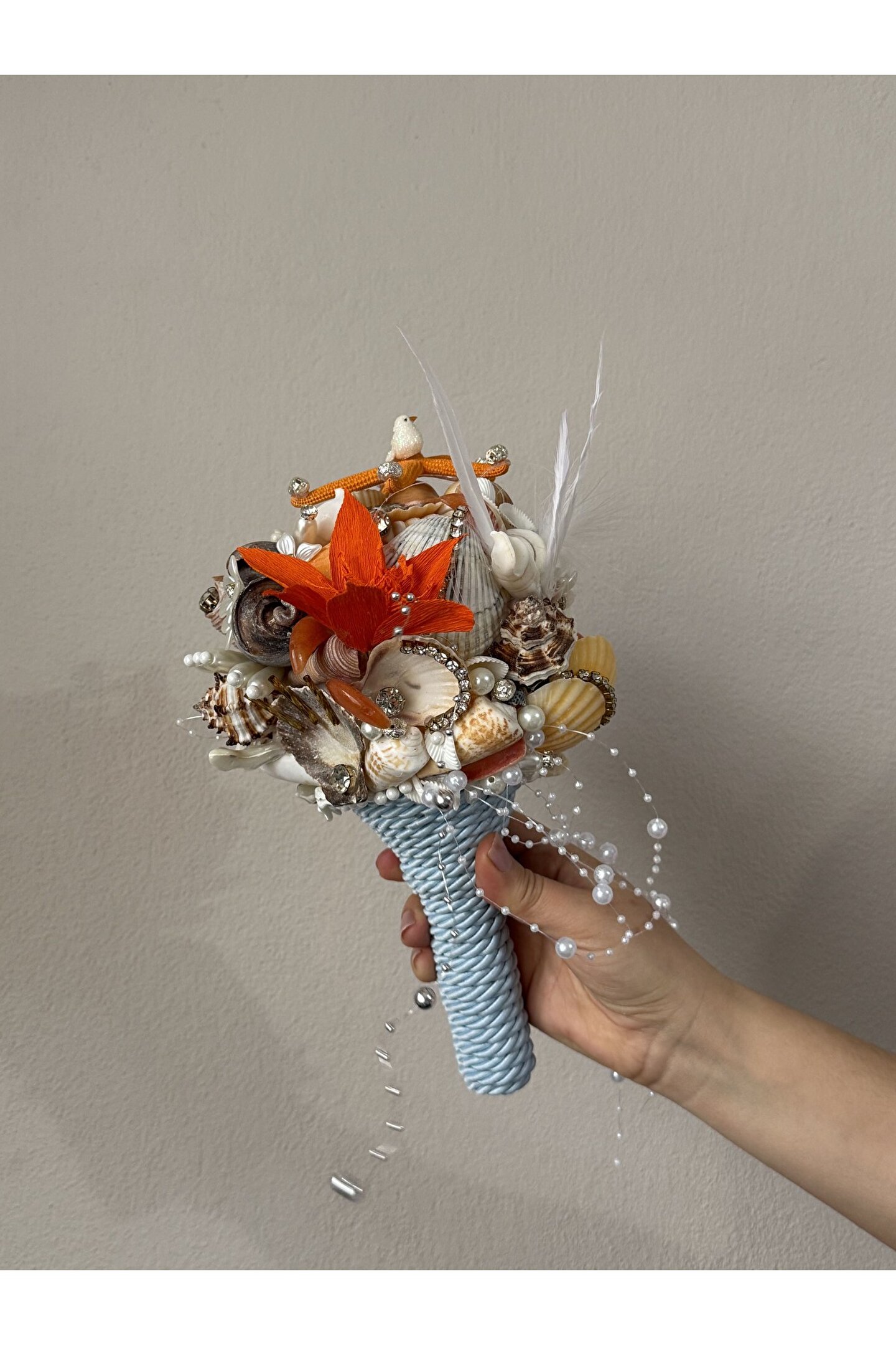 Sıradan çiçek buketlerinin ötesine geçen bu özel tasarım, Bivalvia Accessories imzası taşıyan bir ikon parça. Tamamen el yapımı olan bu gelin buketi; deniz kabukları, doğal taşlar, inciler ve zarif boncuklarla tek tek işlenerek hazırlandı. Her detayında denizin ruhunu ve zarafetini taşıyan bu buket, sadece bir adet üretildi.
