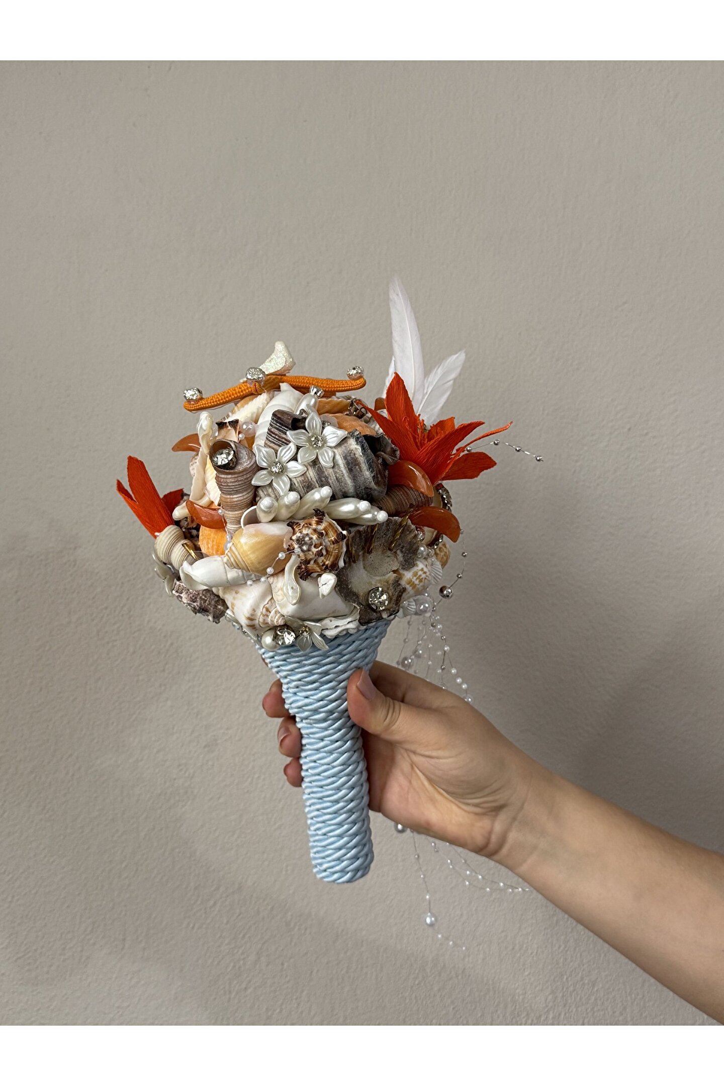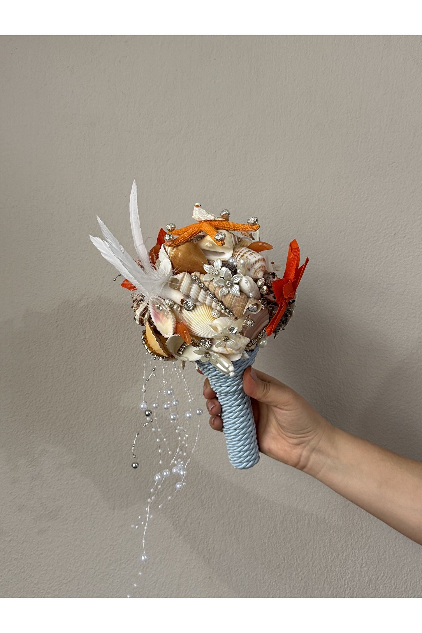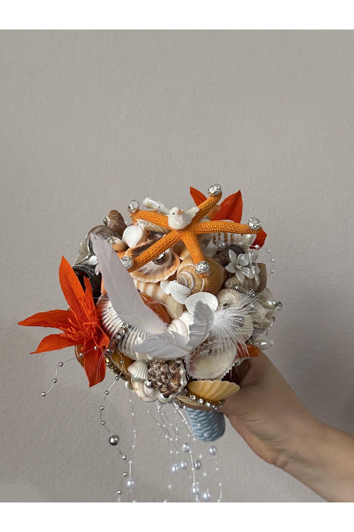 Sıradan çiçek buketlerinin ötesine geçen bu özel tasarım, Bivalvia Accessories imzası taşıyan bir ikon parça. Tamamen el yapımı olan bu gelin buketi; deniz kabukları, doğal taşlar, inciler ve zarif boncuklarla tek tek işlenerek hazırlandı. Her detayında denizin ruhunu ve zarafetini taşıyan bu buket, sadece bir adet üretildi.