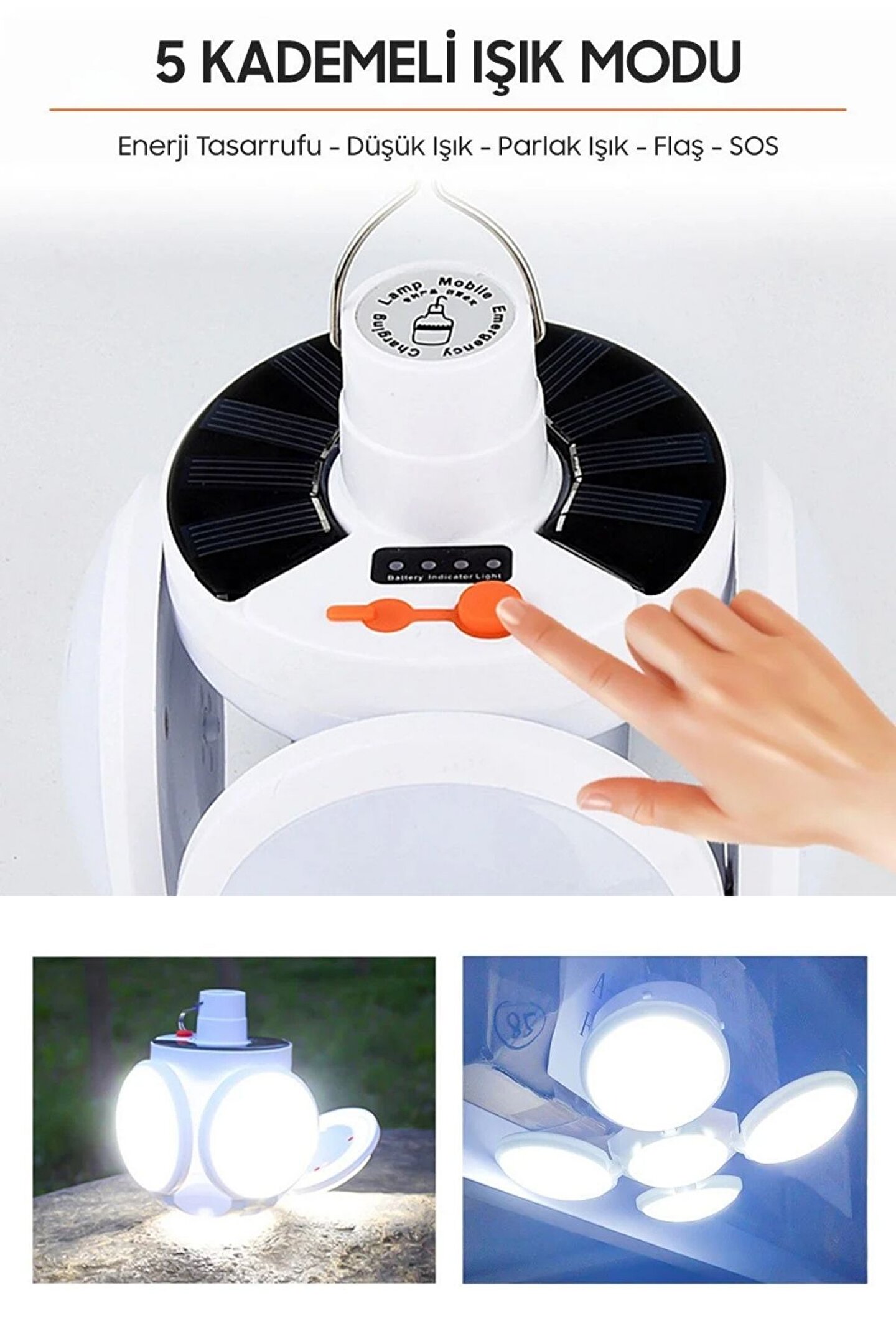•    -5 Aydınlatma Modu: Enerji Tasarrufu, Düşük Işık, Parlak Işık, Flaş, SOS Modları Mevcuttur.