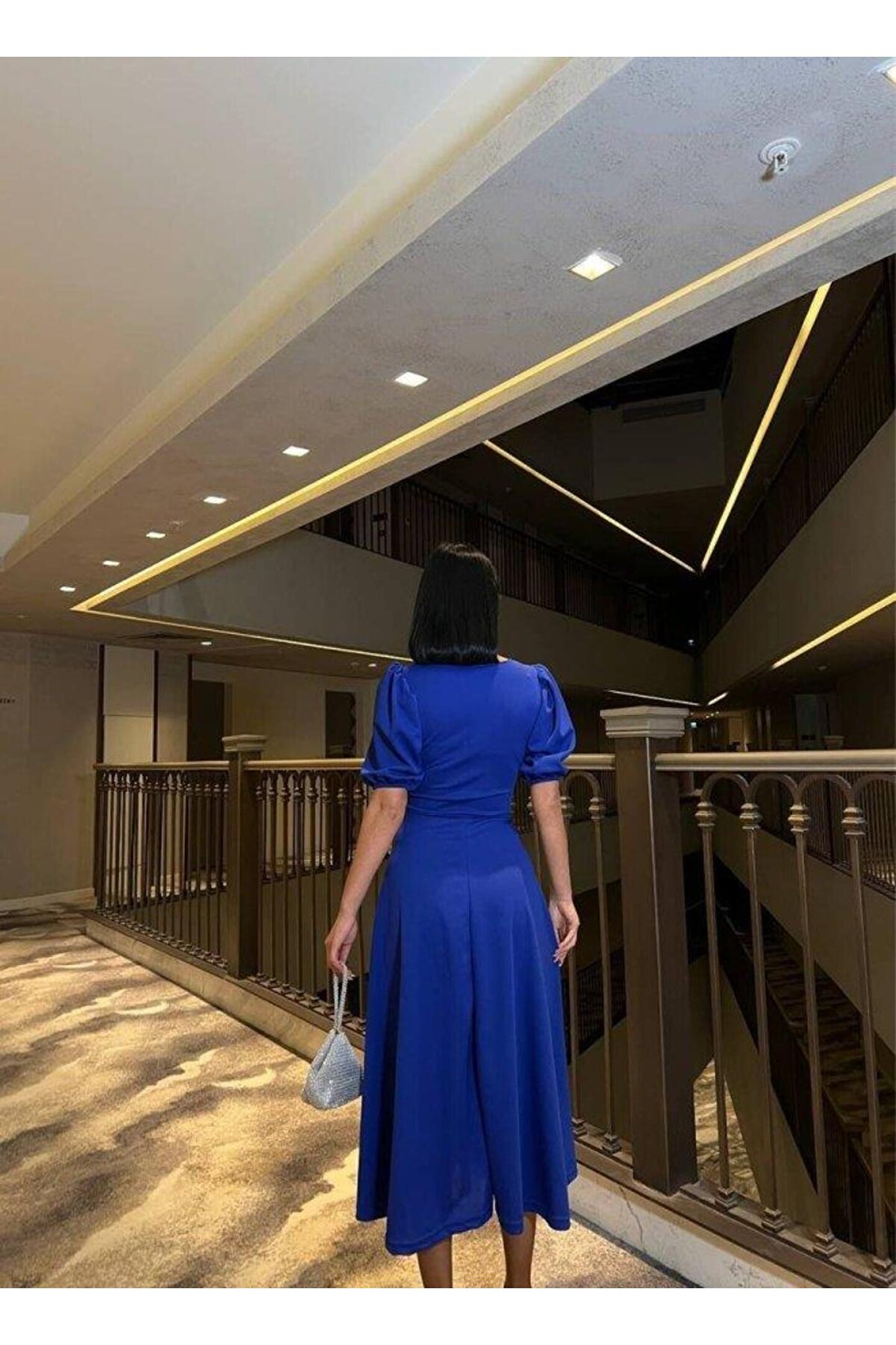BÜŞRA TEZEL MODA Kadın Bisiklet Yaka Kısa Kol Lastik Detay Uzun Elbise