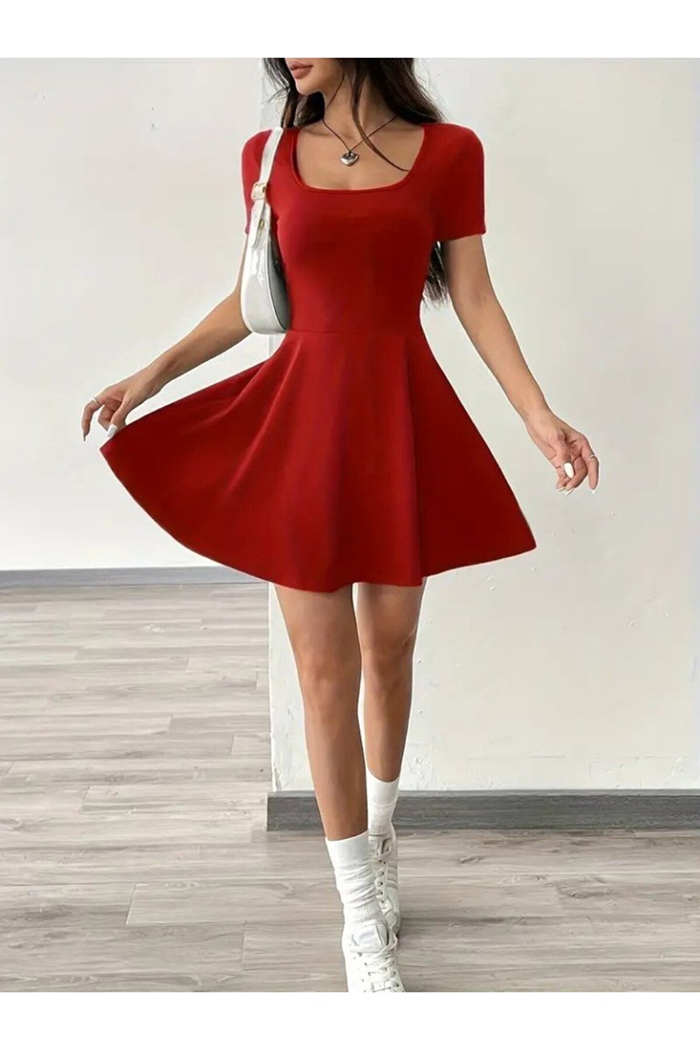 BÜŞRA TEZEL MODA Kadın Kısa Kollu Kare Yaka Short Detaylı Cepli Dalgıç Elbise