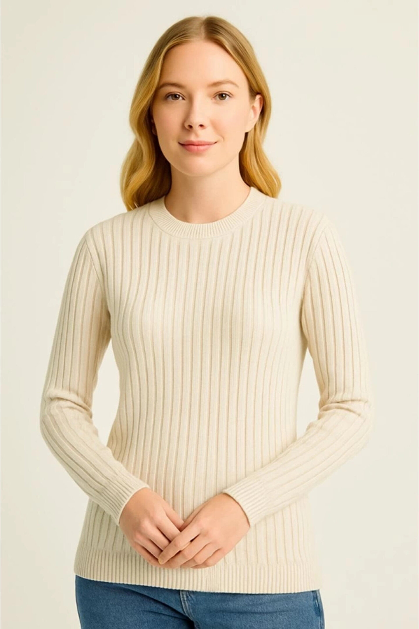 Bisiklet Yuvarlak Yaka Triko Kazak Pamuklu Kalın Fitilli Dokuma, Regular Fit Uzun Kollu Kışlık Model - Bej