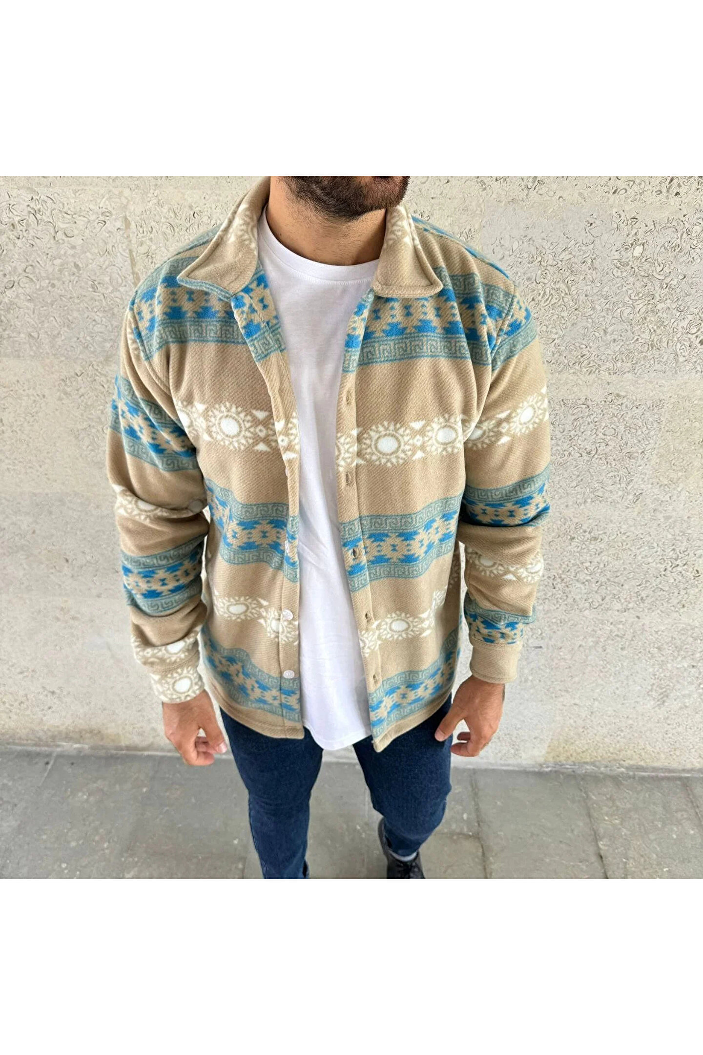 Butik Erkek Desenli Polar Gömlek – Etnik Şerit Desen Yakalı, Uzun Kollu, Düğmeli, Oversize Rahat Kalıp - S