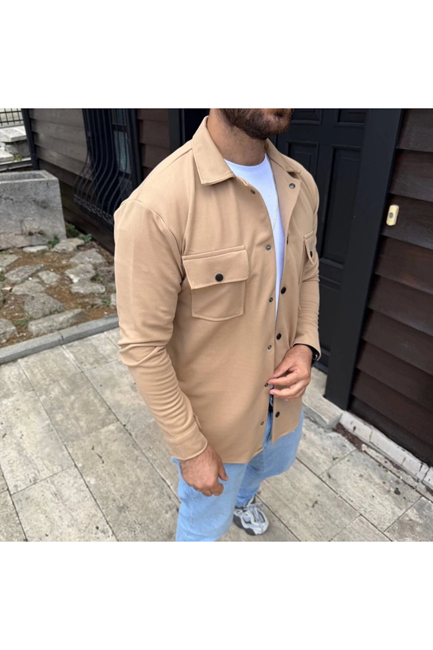 Erkek Diagonal Kumaş Cepli Çıtçıtlı Uzun Kollu, Gömlek Oversize Rahat Kalıp Günlük Şık Stil - Bej