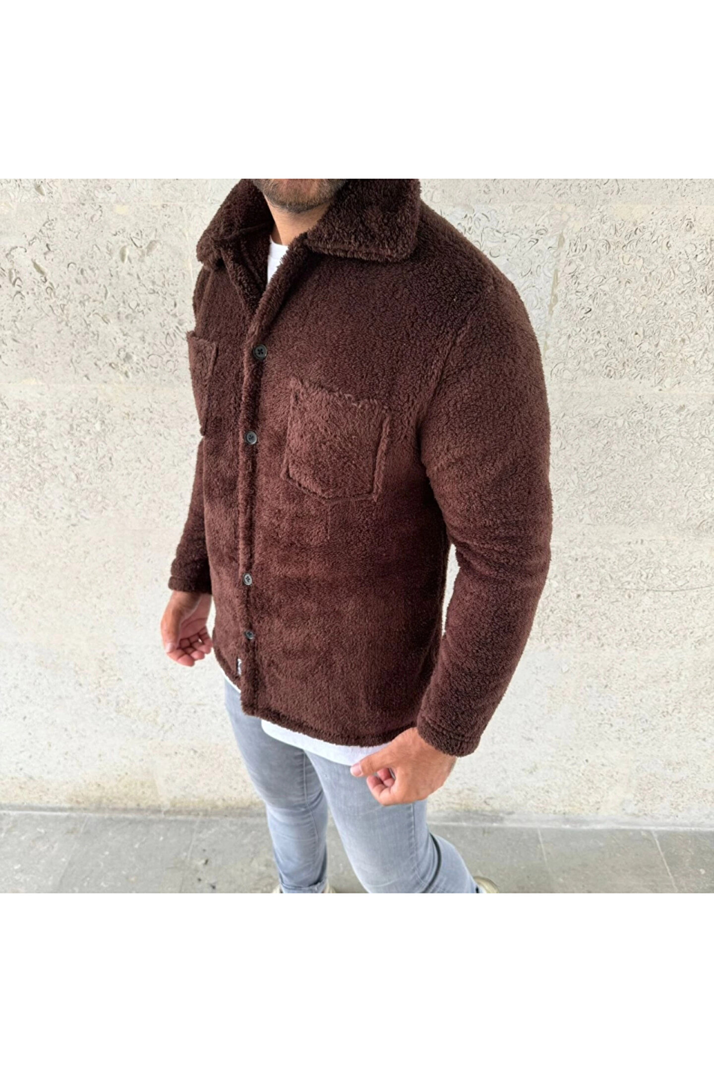 Erkek Pelüş Polar Hırka Gömlek – Yakalı, İlik Düğmeli, Göğüs Cepli, Yumuşak Dokulu Kışlık Regular Fit Rahat Günlük Model - Kahverengi