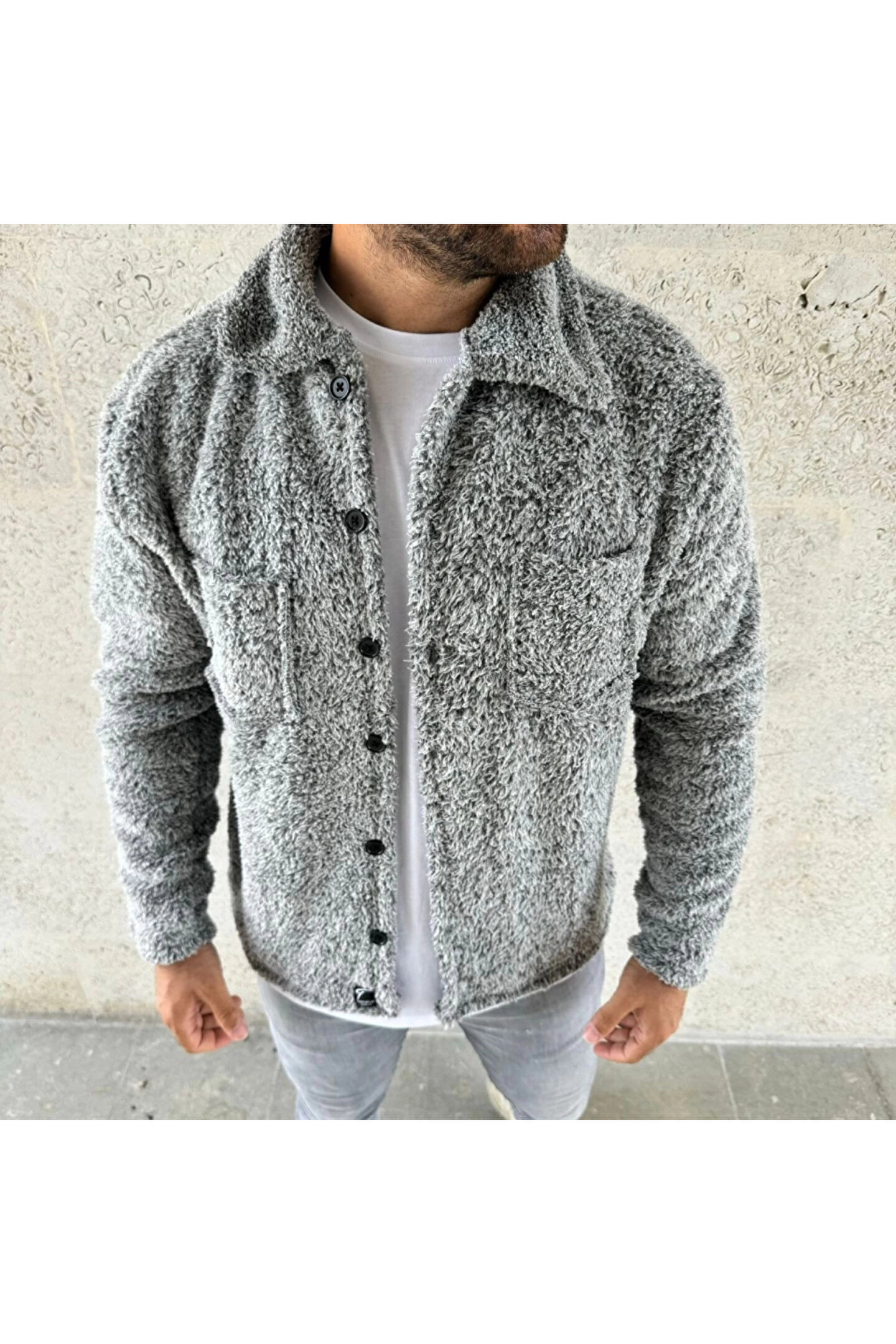 Erkek Pelüş Polar Hırka Gömlek – Yakalı, İlik Düğmeli, Göğüs Cepli, Yumuşak Dokulu Kışlık Regular Fit Rahat Günlük Model - Gri