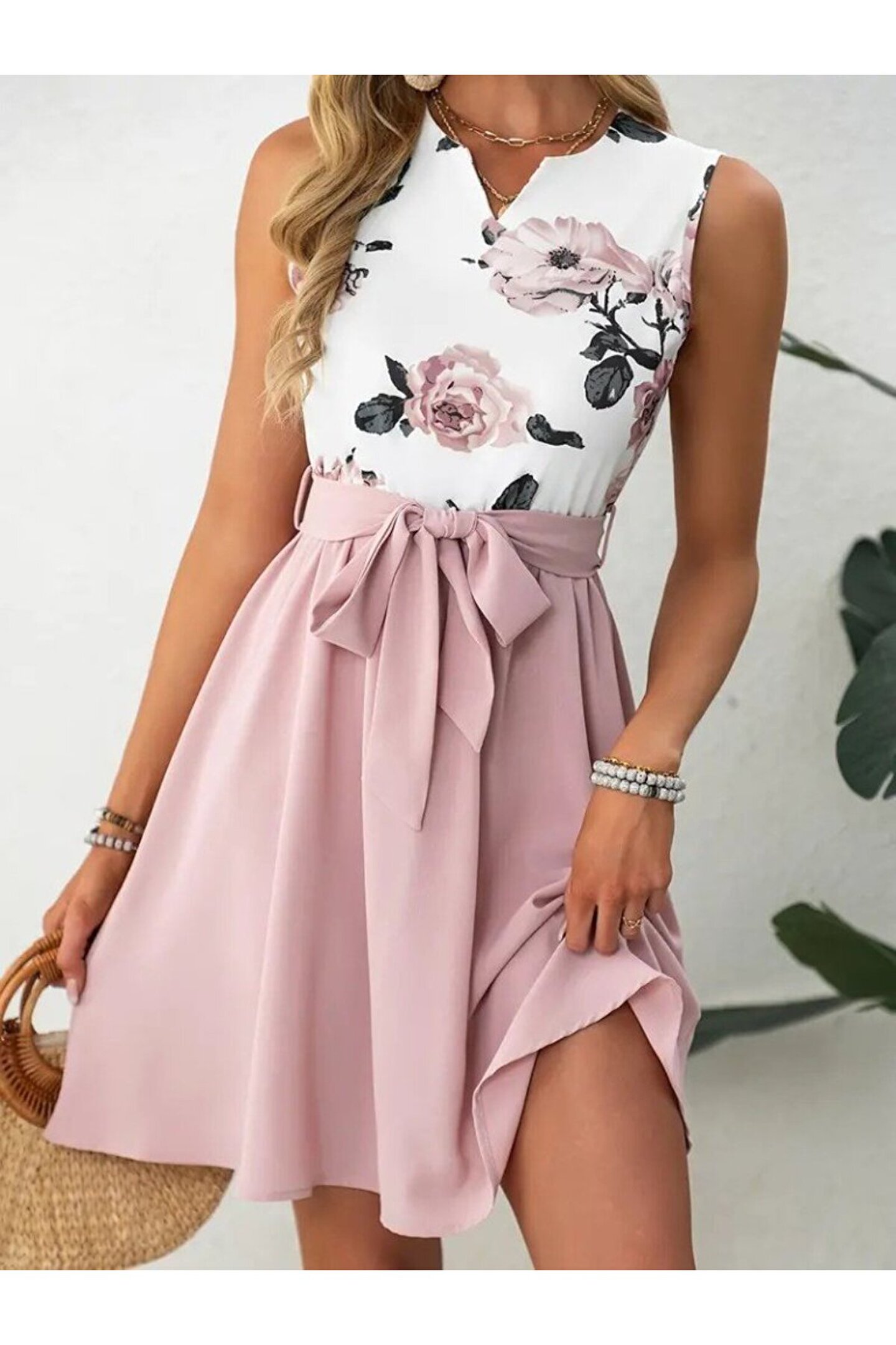 Butik Gökyüzü Moda Kadın Sıfır Kollu V Yakalı çiçek Baskılı Beli Kuşaklı Dalgıç Elbise
