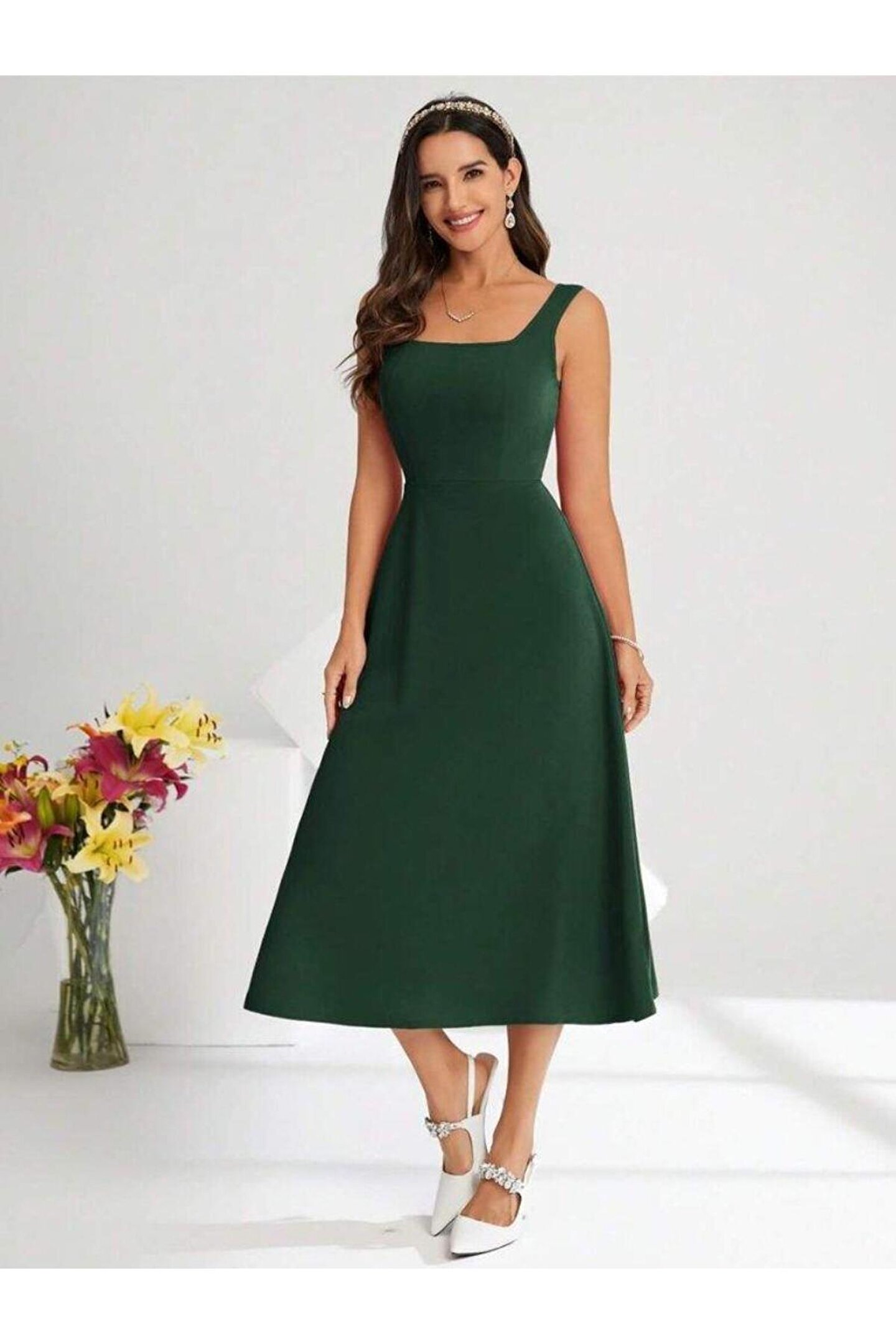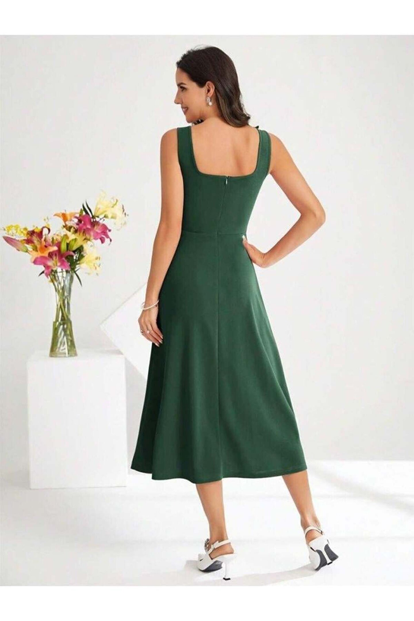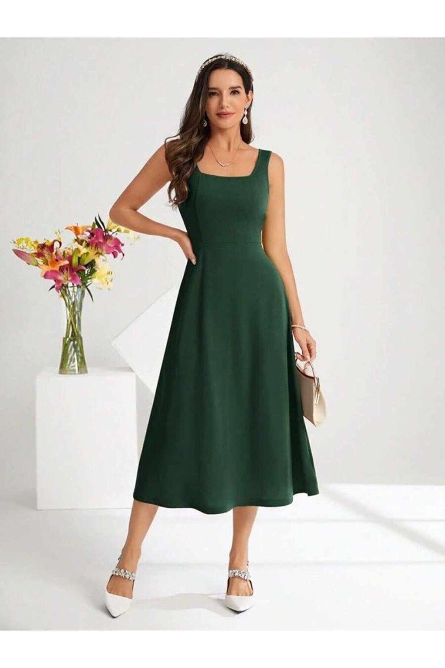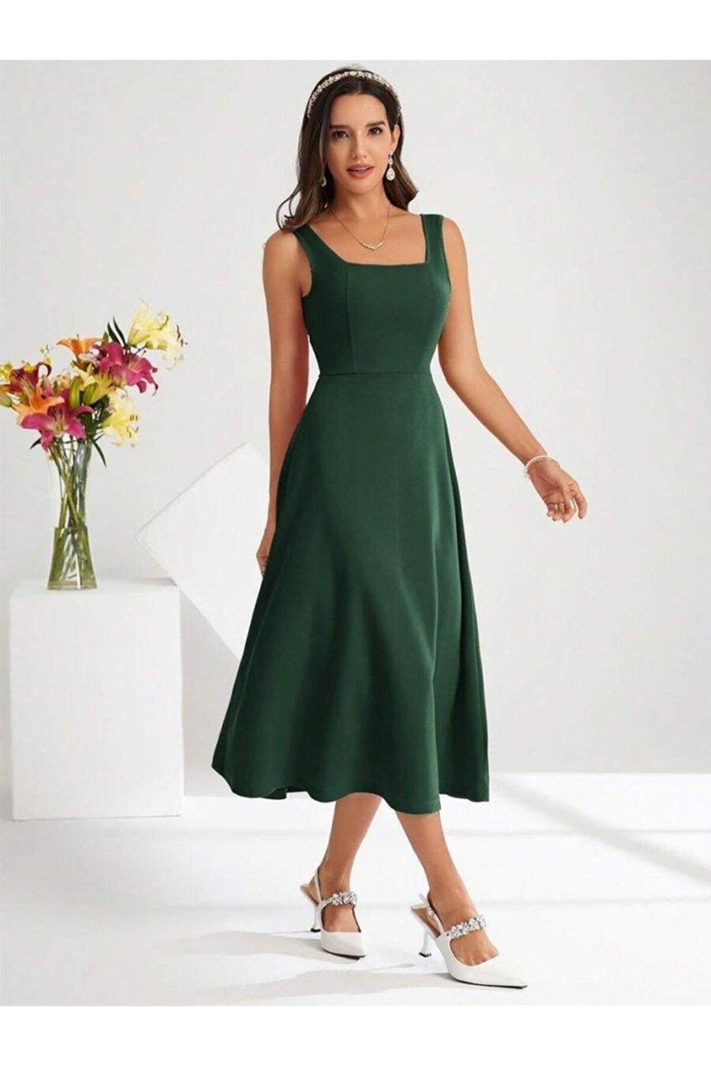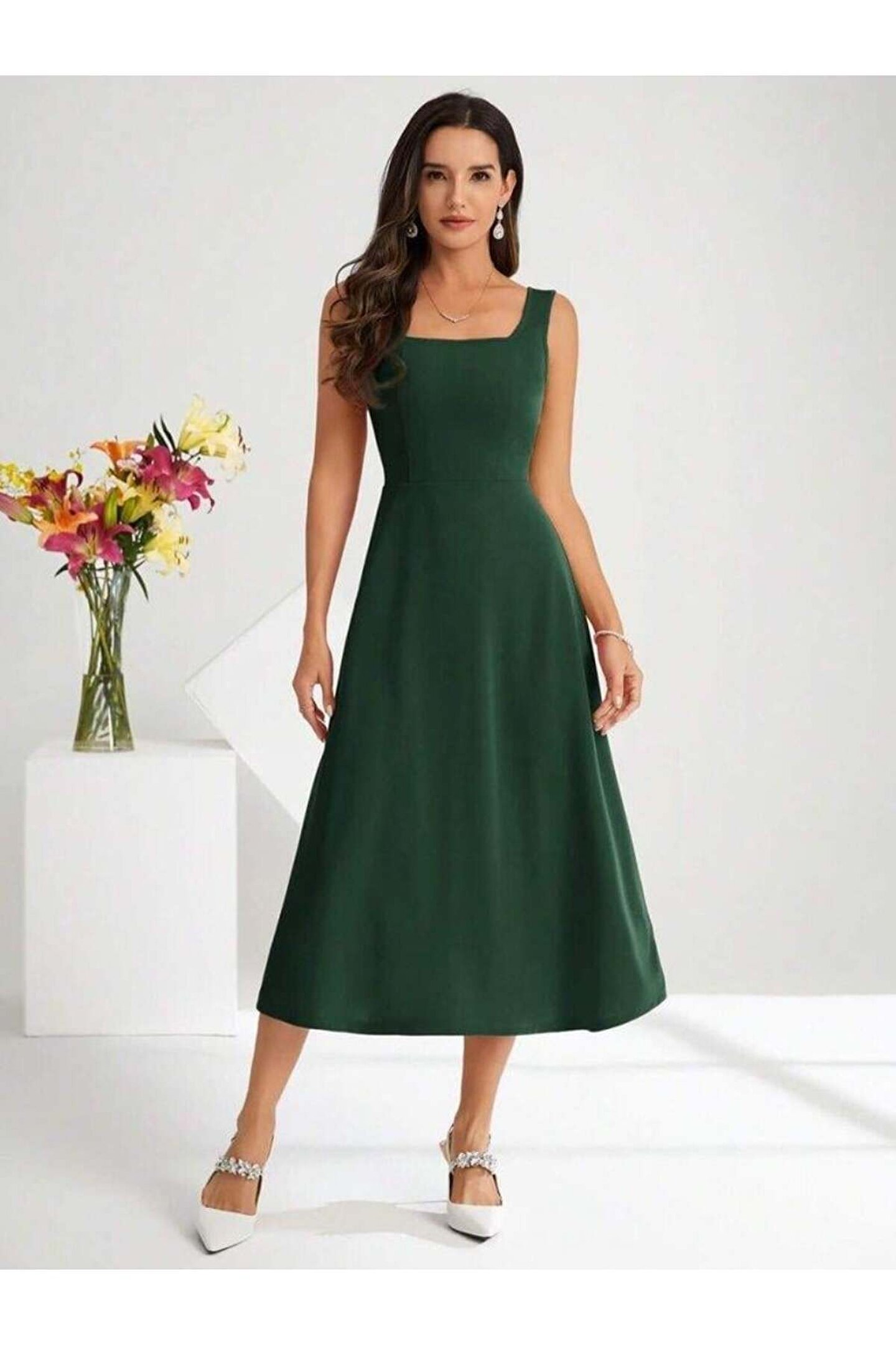 Butik Kadın Askılı Kare Yakalı Midi Ithal Krep Elbise