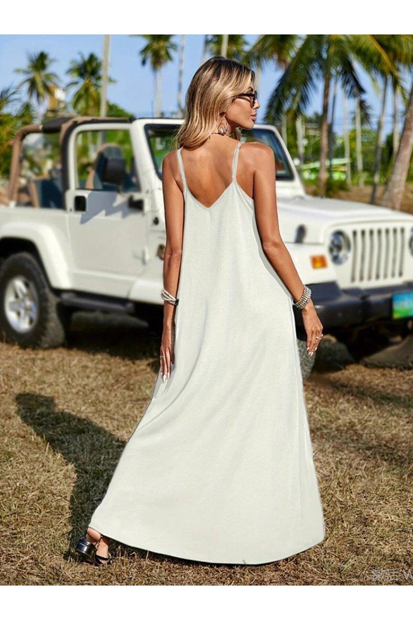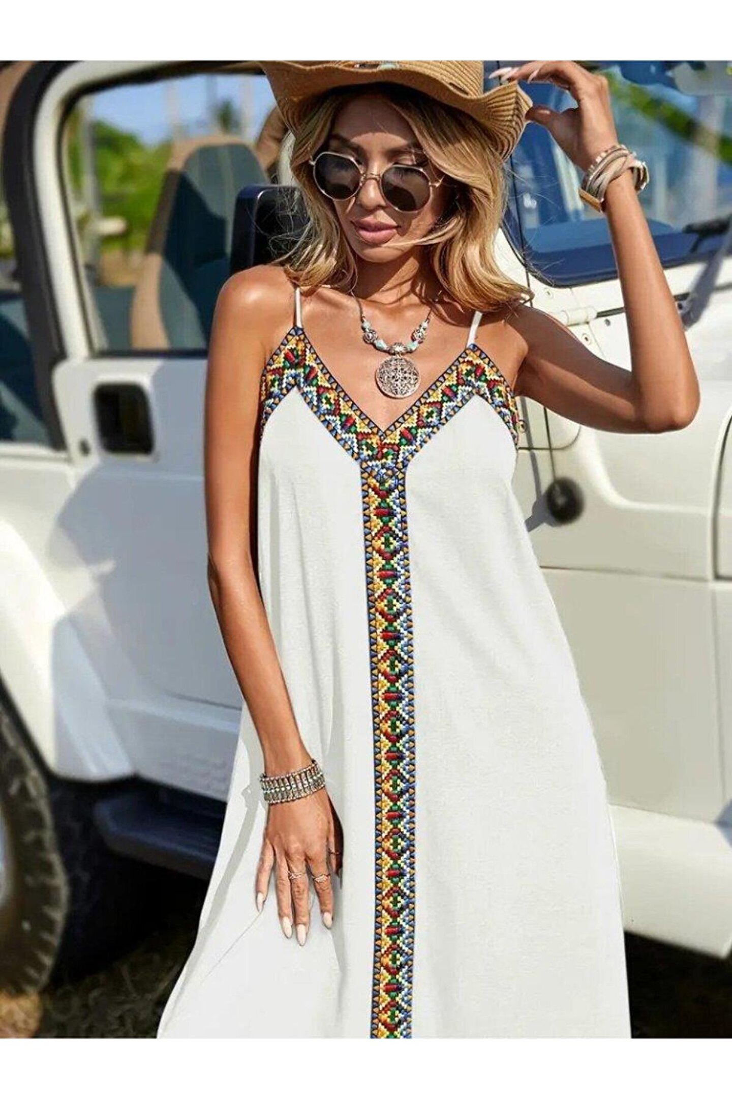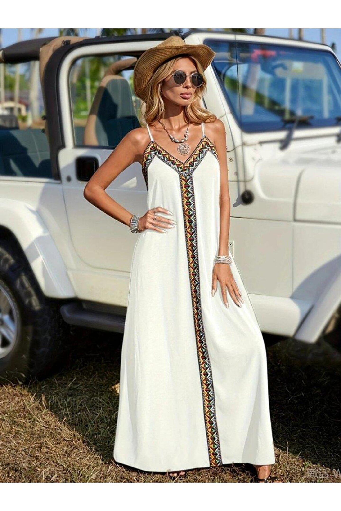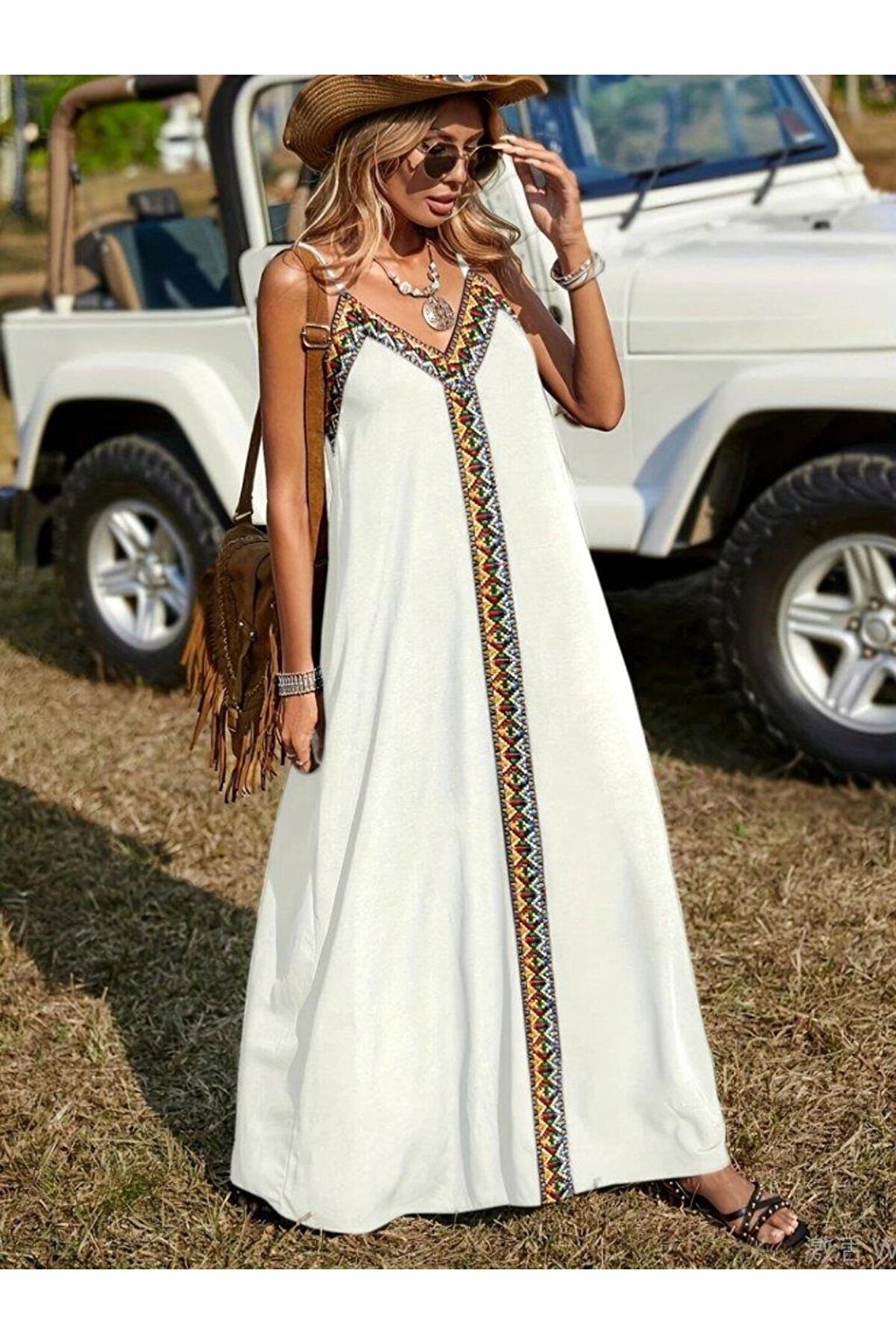 Butik Kadın Askılı V Yakalı Etnik şerit Detaylı Uzun Viskon Elbise