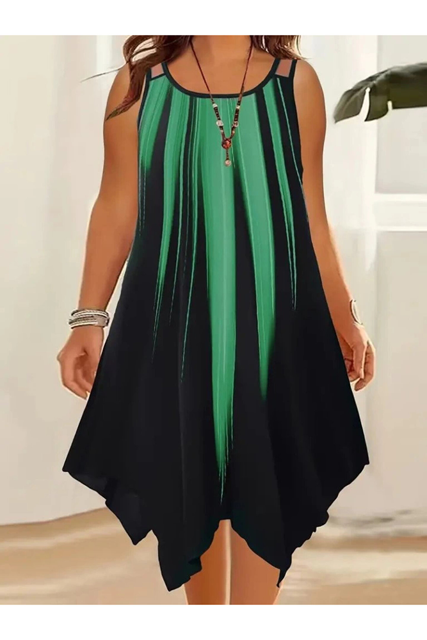 Kadın Askılı Yuvarlak Yaka Asimetrik Detaylı Desenli Süprem Elbise