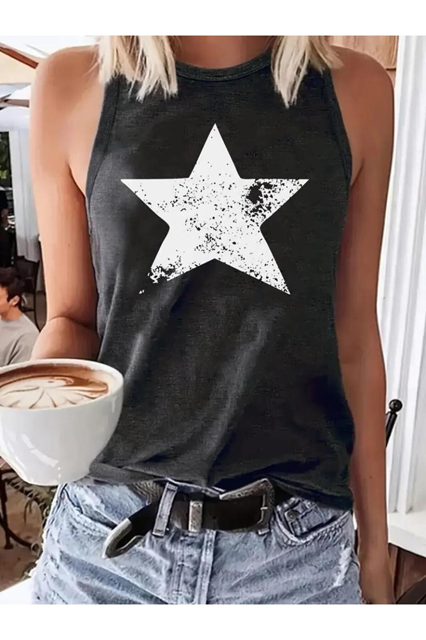 Kadın Askılı Yuvarlak Yaka Yıldız Desenli Süprem Bluz