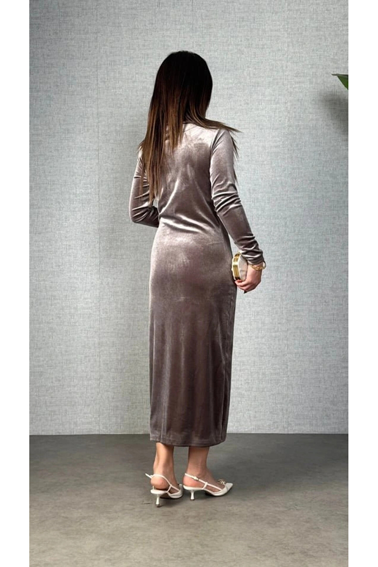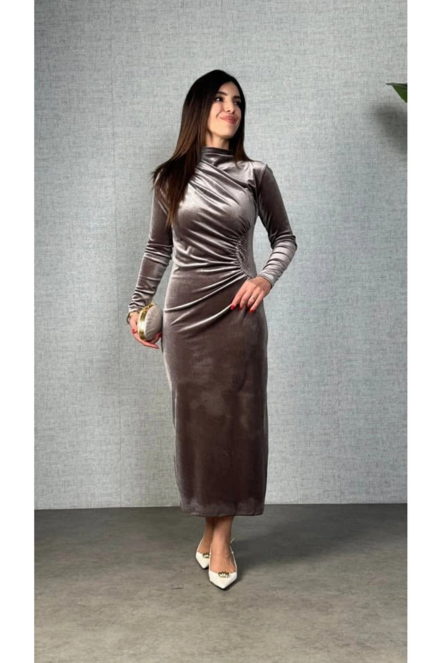 Kadın Balıkçı Yaka Büzgü Ve Taş Işleme Detay Maxi Boy Kadife Elbise