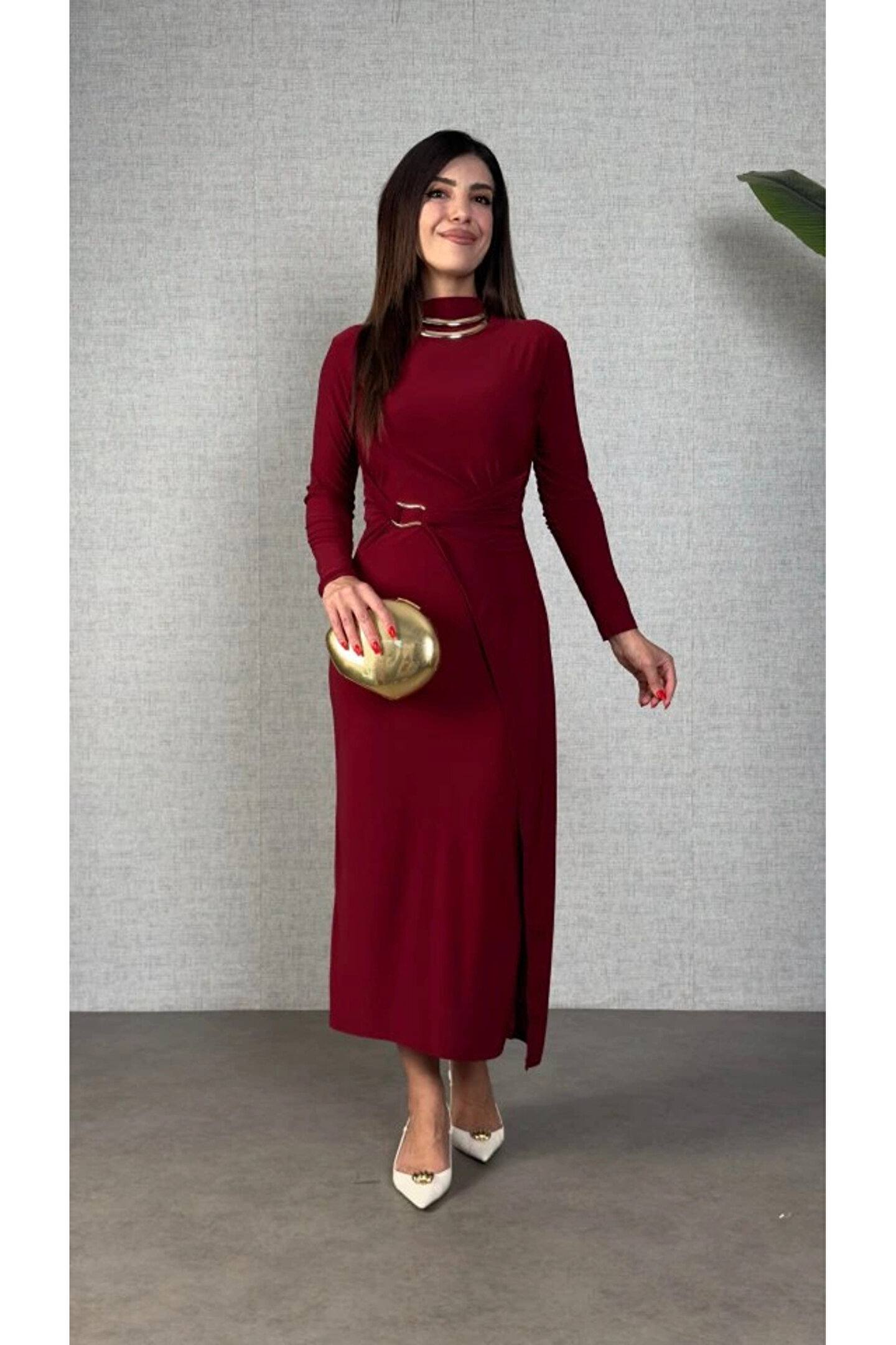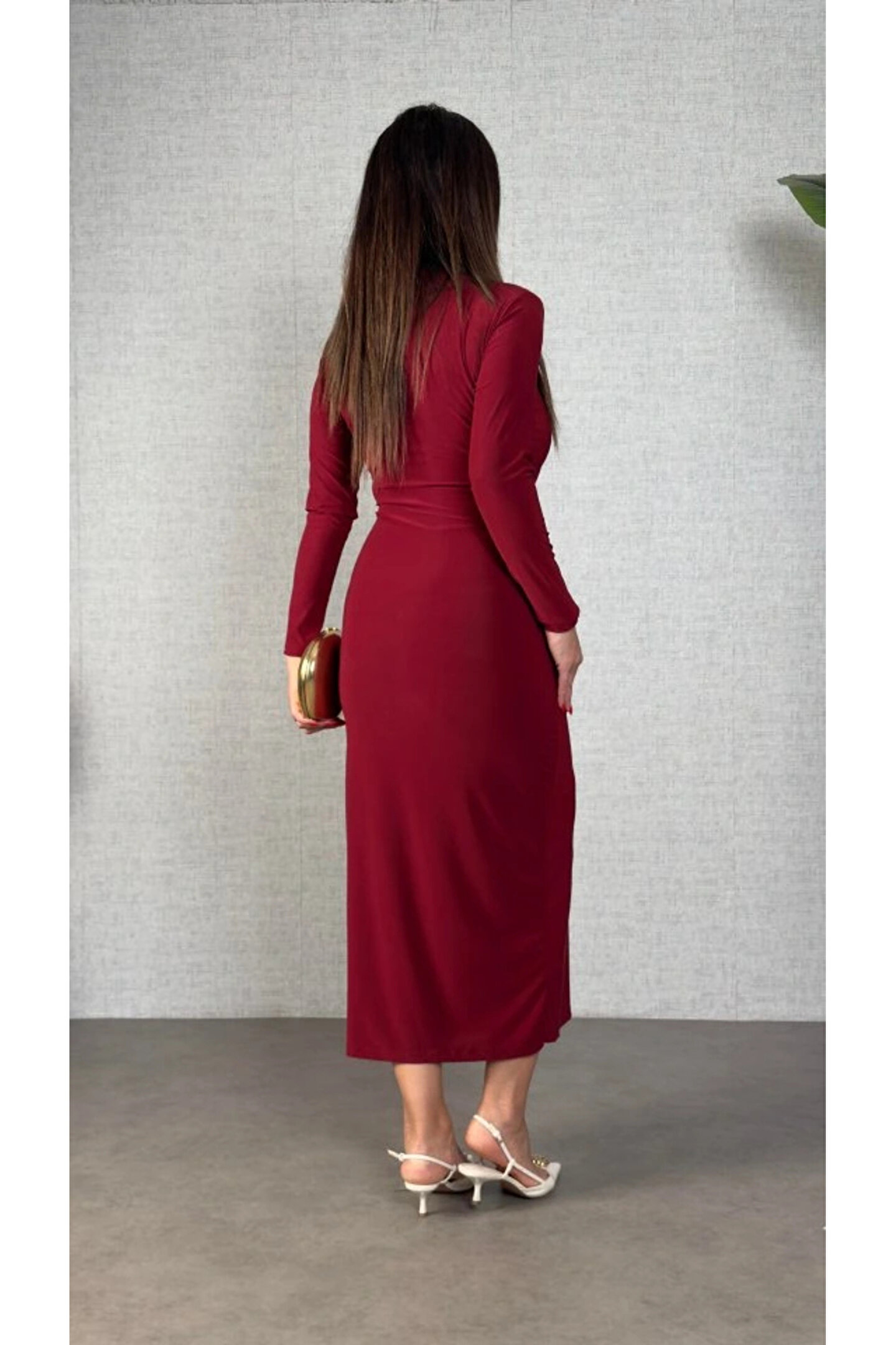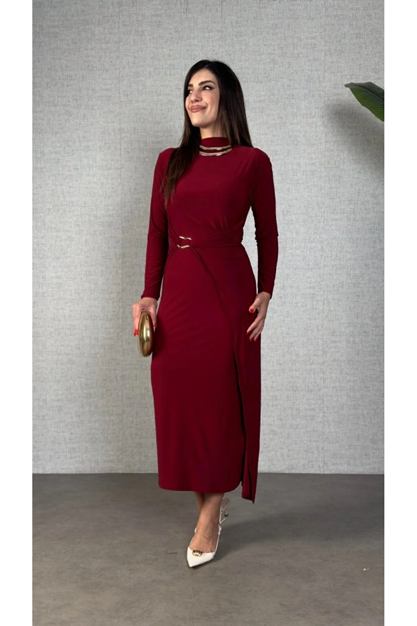 Butik Kadın Balıkçı Yaka Toka Detay Sandy Kumaş Midi Boy Elbise